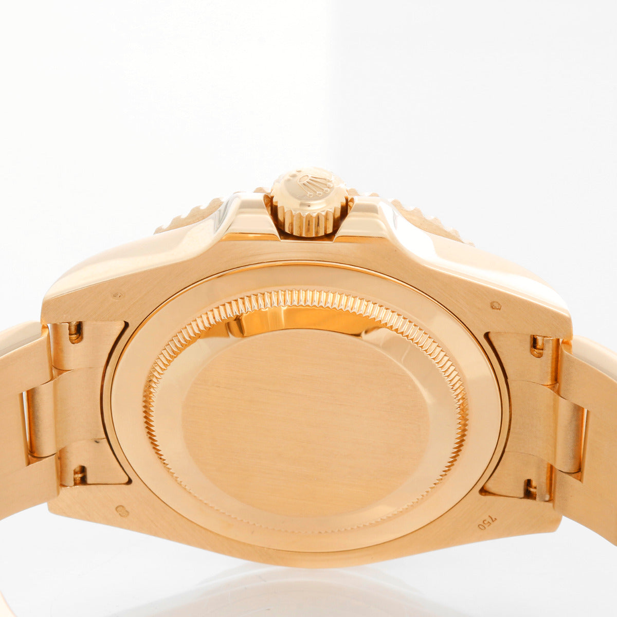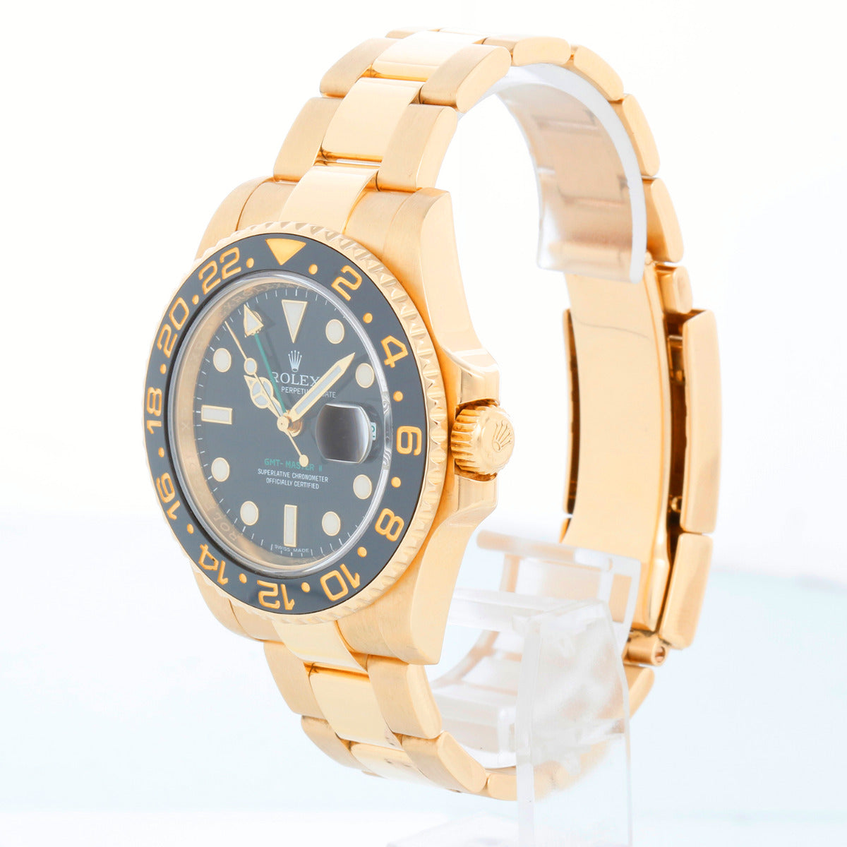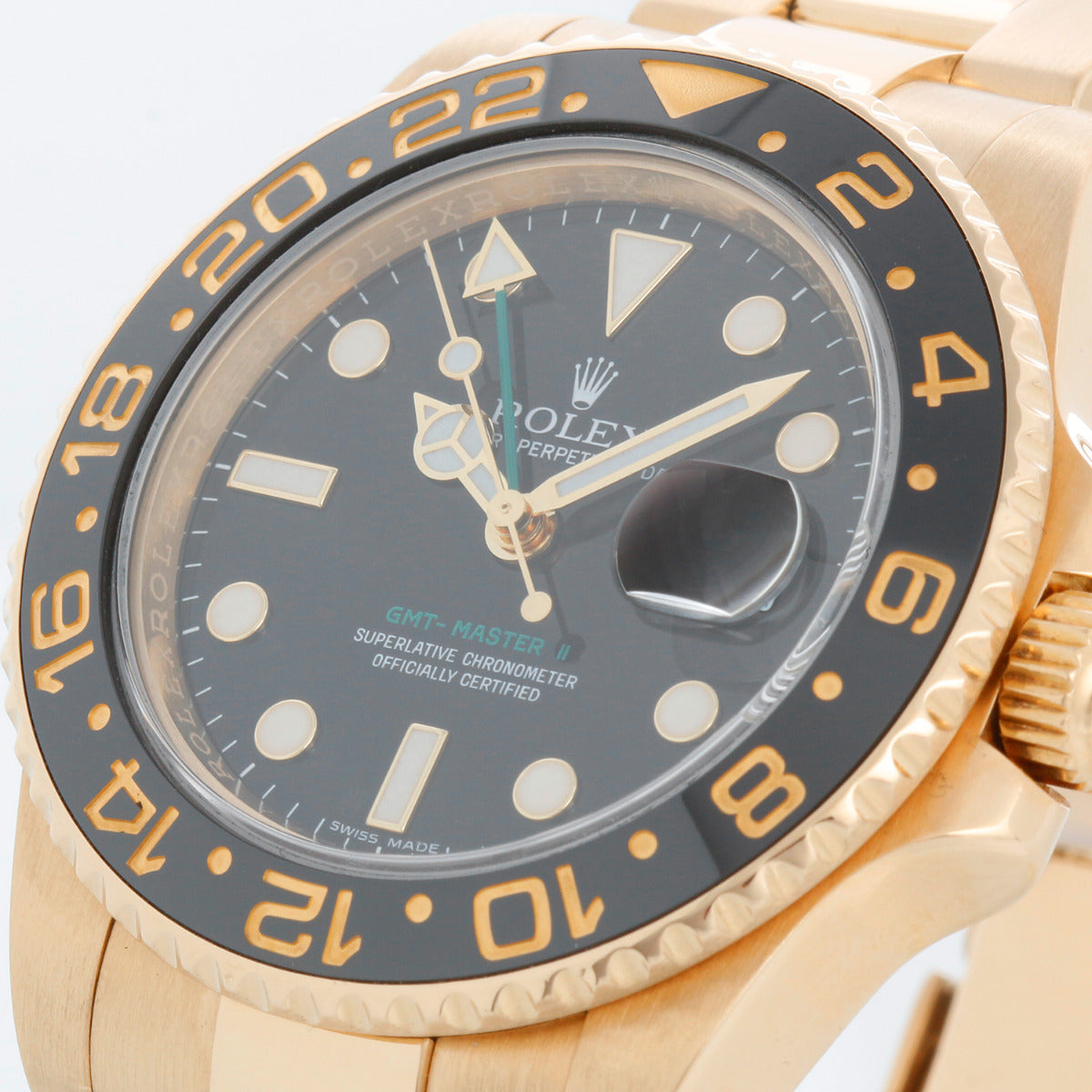 Rolex GMT - Master II Men's 18k Yellow Gold Watch 116718 - Automatic winding, 31 jewels, Quickset, sapphire crystal. 18k yellow gold case; rotating bezel with black ceramic insert (40mm diameter). Black dial with luminous style markers. 18k yellow gold Oyster bracelet with flip-lock clasp. Pre-owned with Rolex box and books