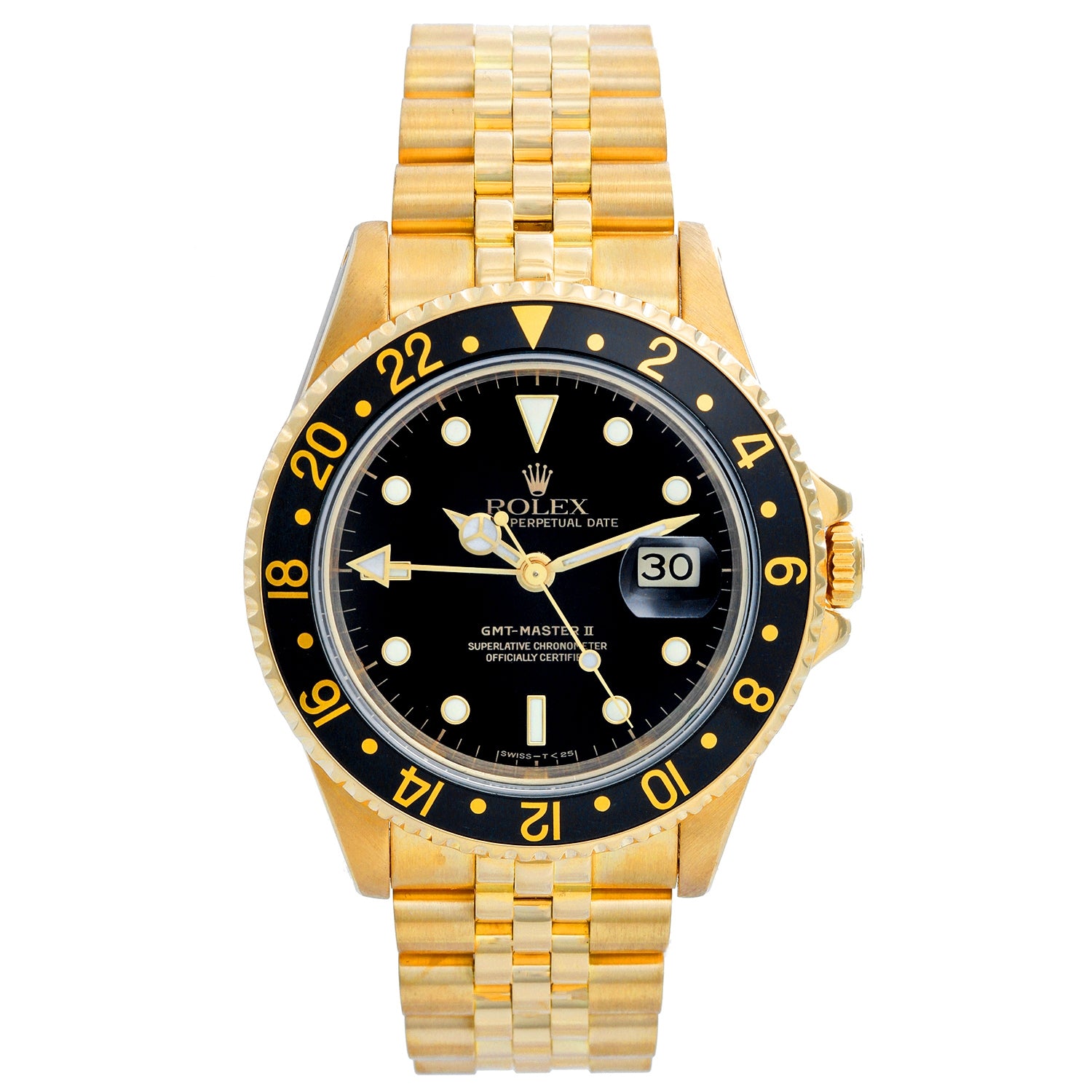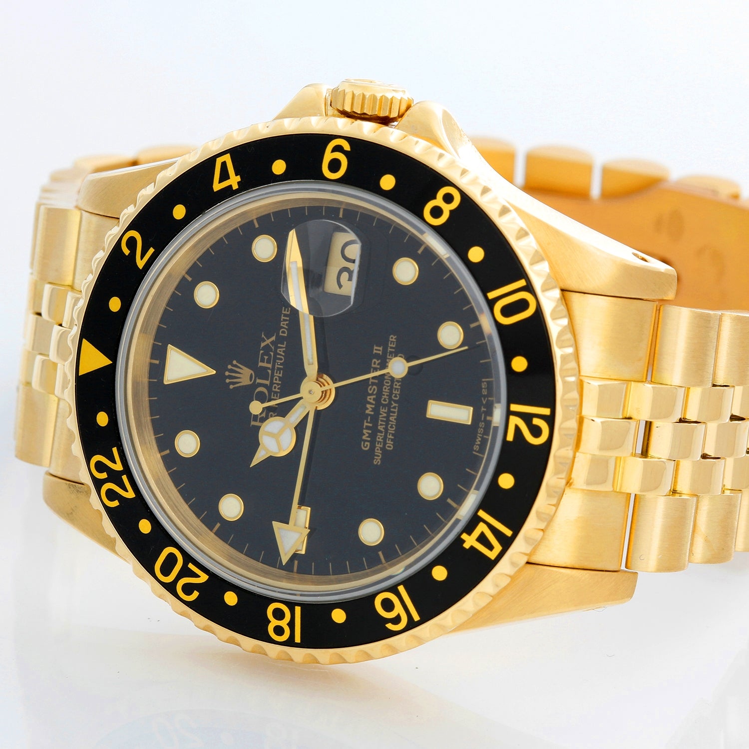 Rolex GMT - Master II 18K Yellow Gold Men's Watch 16718 - Automatic winding, 31 jewels, Quickset, sapphire crystal. 18k yellow gold case with rotating bezel (40mm diameter). Black dial with luminous markers. 18k yellow gold Jubilee bracelet. Pre-owned with box and books.