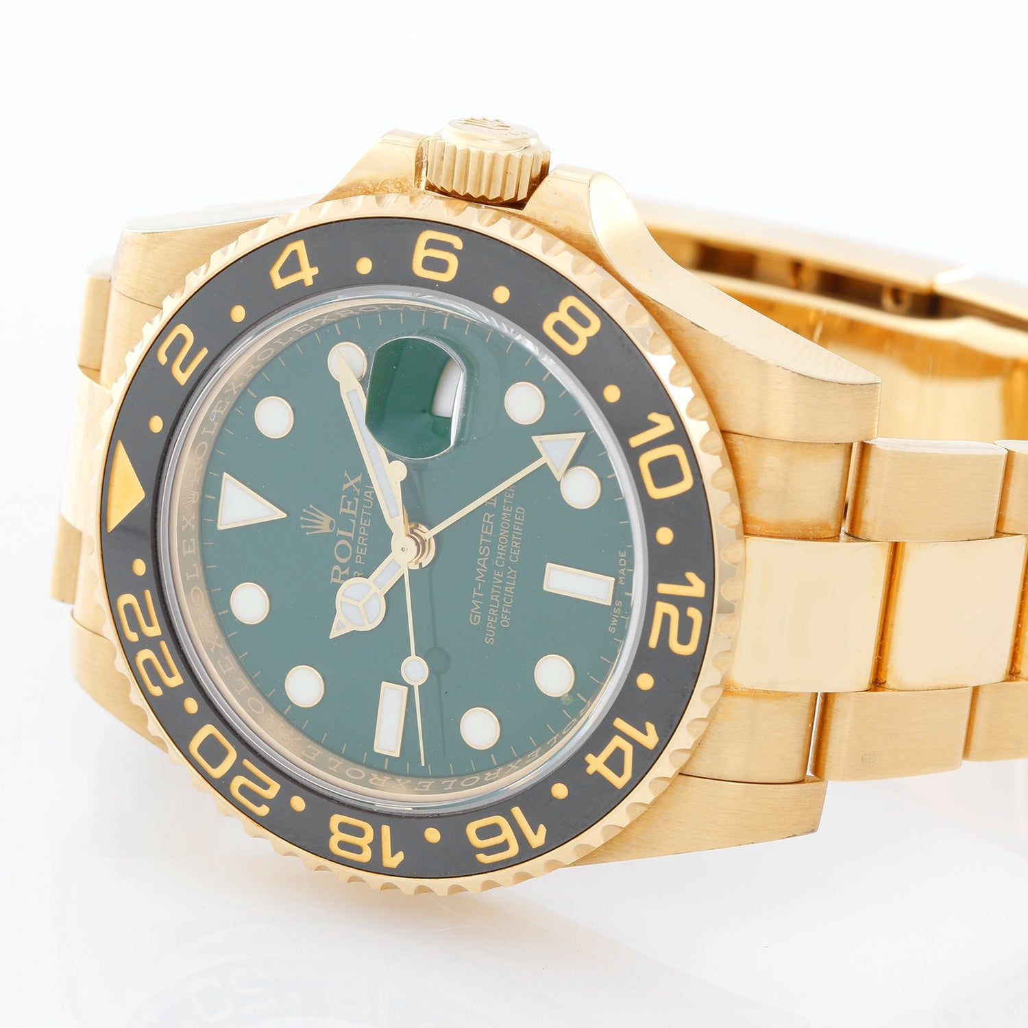 Rolex GMT - Master II Anniversary Edition Men's Watch 116718 - Automatic winding. 18k yellow gold case; black bezel insert (40mm diameter). Green dial with luminous markers. 18k yellow gold Oyster bracelet. Unused with Rolex box and with papers.