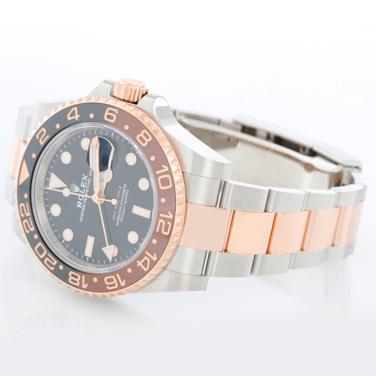 Rolex GMT-Master II Men's Rose Gold and Stainless Steel Rootbeer Watch 126711 - Automatic winding, 31 jewels, Quickset, sapphire crystal. 18k Rose gold case; rotating black and brown bezel (40 mm). Black dial with luminous style markers. 18k Rose gold and Stainless Steel Oyster bracelet with flip-lock clasp. Pre-owned with Rolex box and papers.