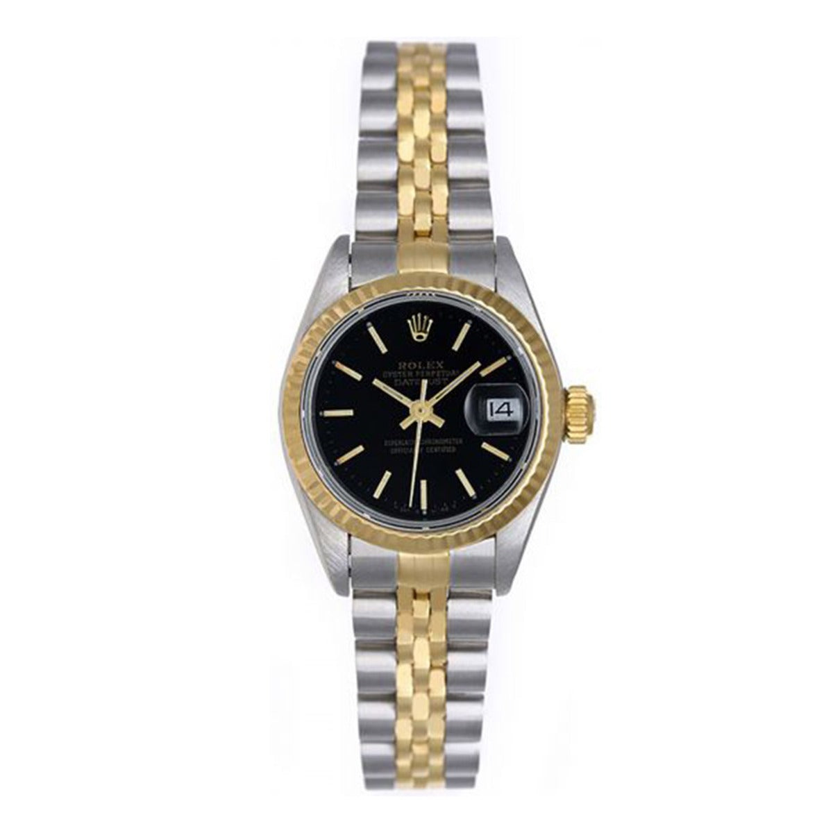 Rolex Ladies Datejust 2-Tone Steel/Gold Watch Black Stick Dial 69173 - Automatic winding, 29 jewels, Quickset date, sapphire crystal. Stainless steel case with 18k yellow gold fluted bezel (26mm diameter). Black dial with raised gold stick markers. Stainless steel and 18k yellow gold Jubilee bracelet. Pre-owned with custom box.