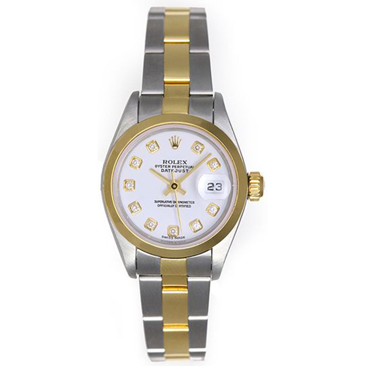 Rolex Ladies Datejust Steel & Gold Watch 79163 White Diamond Dial - Automatic winding, 31 jewels, Quickset, sapphire crystal, Stainless steel case with 18k yellow gold smooth bezel (26mm diameter), White dial with factory diamond hour markers, Stainless steel and 18k yellow gold Oyster bracelet, Pre-owned with custom box.