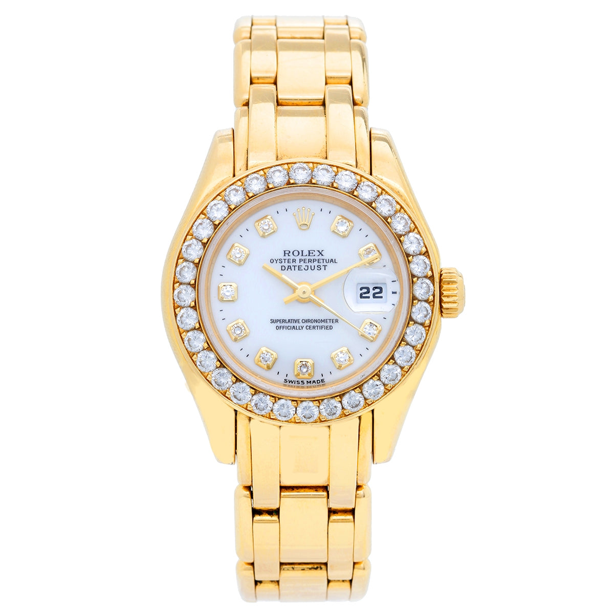 Rolex Ladies Masterpiece/Pearlmaster Gold Diamond Watch 69298 - Automatic winding, 31 jewels, Quickset, sapphire crystal. 18k yellow gold case with factory diamond bezel (29mm diameter). Factory Rolex White diamond dial. 18k yellow gold Pearlmaster bracelet. Pre-owned with box and books.