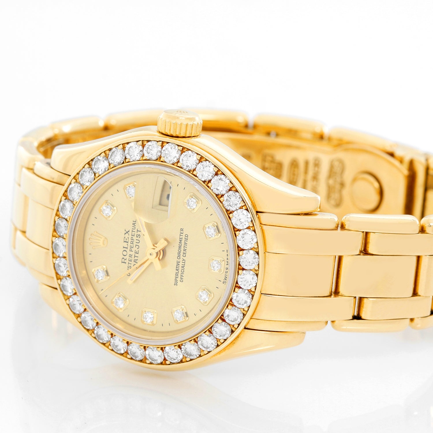 Rolex Ladies Masterpiece/Pearlmaster Gold Diamond Watch 69298 - Automatic winding, 31 jewels, Quickset, sapphire crystal. 18k yellow gold case with factory diamond bezel (29mm diameter). Factory Rolex Champagne diamond dial. 18k yellow gold Pearlmaster bracelet. Pre-owned with box and books.