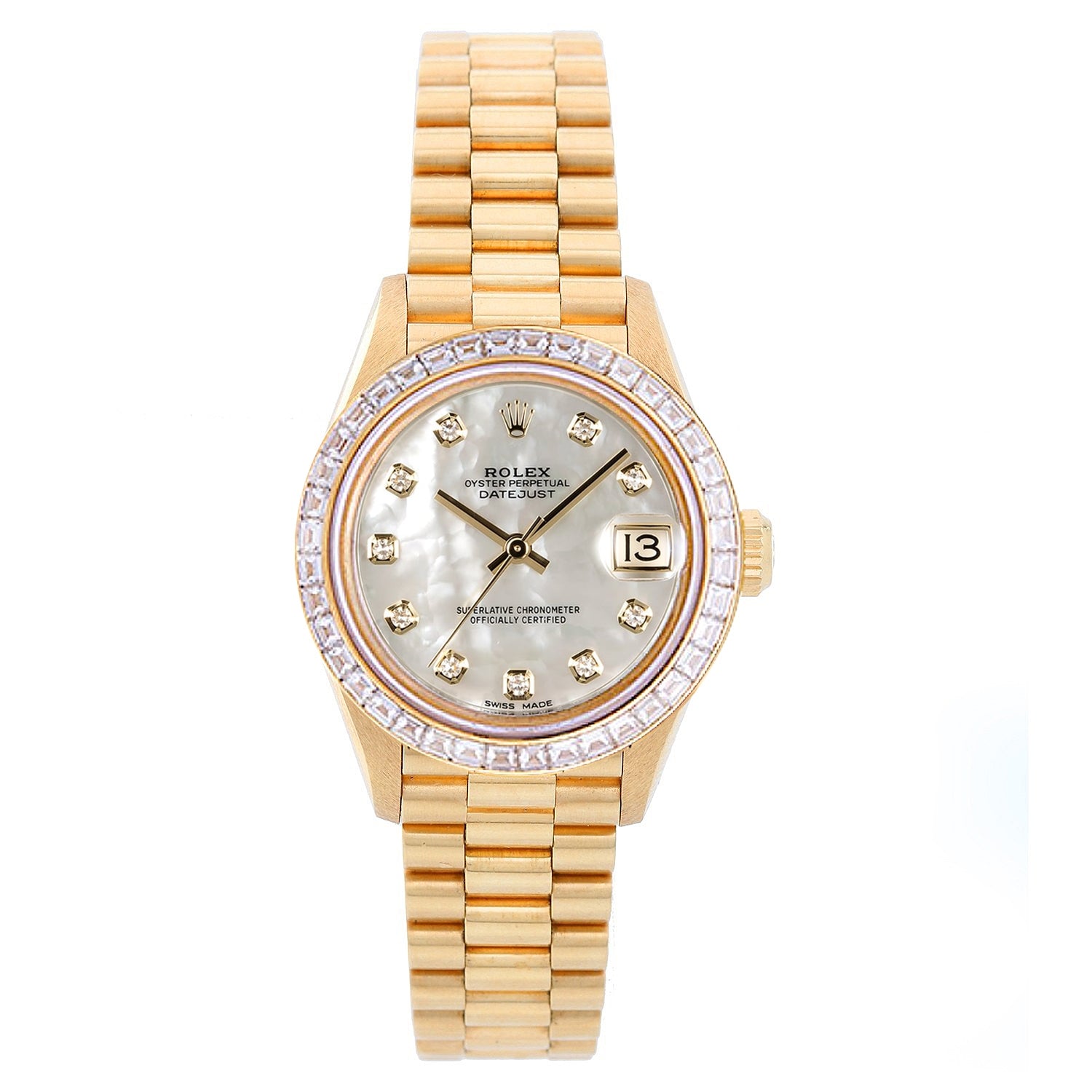 Rolex Ladies President 18k Gold & Diamond Watch 79178 - Automatic winding, 29 jewels, Quickset date, sapphire crystal. 18k yellow gold case with factory channel set baguette diamond bezel (26mm diameter). Factory Rolex Mother of Pearl diamond dial. 18k yellow gold hidden-clasp President bracelet. Pre-owned with Rolex box and books.