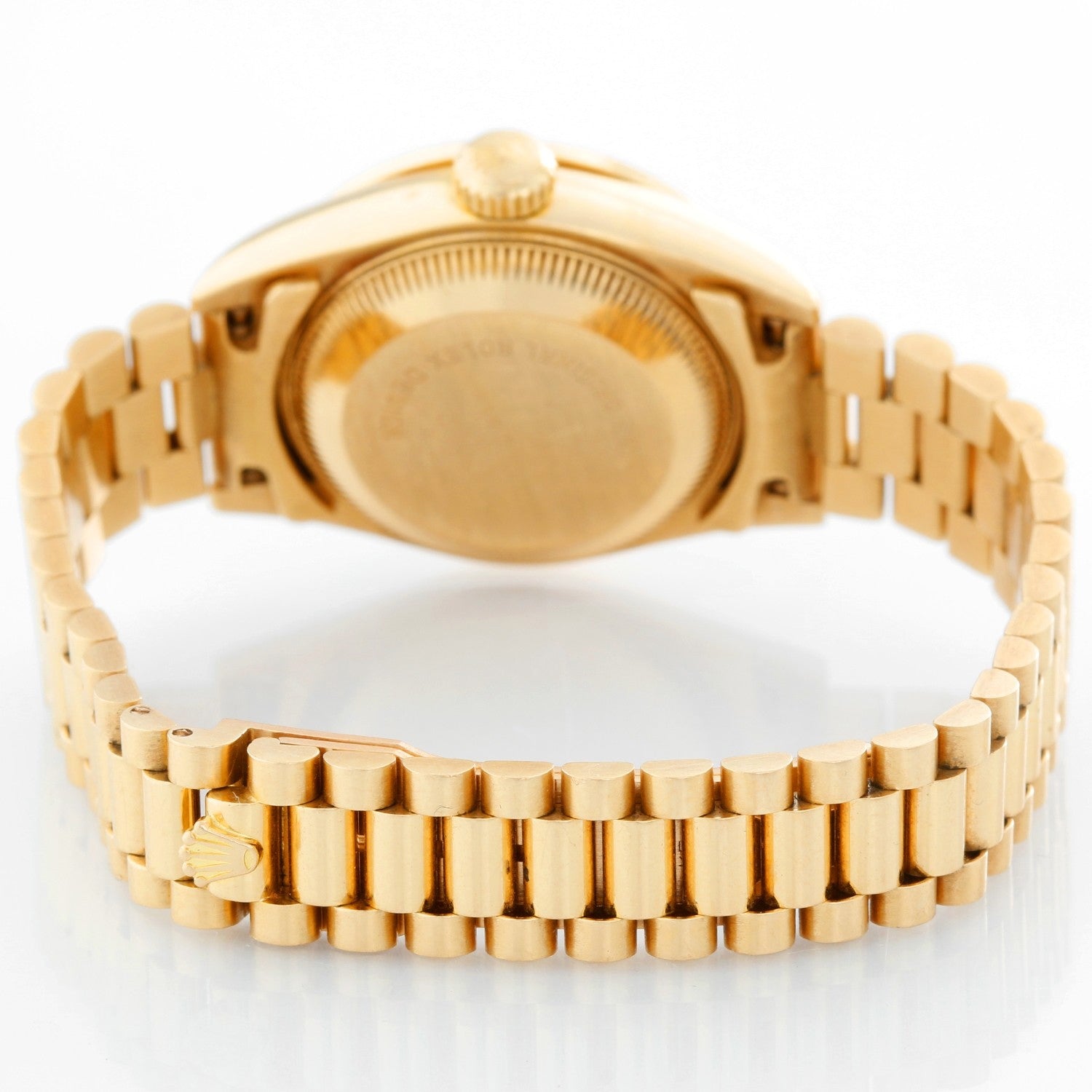 Rolex Ladies President Model 69178 - Ladies automatic winding wristwatch with date. 18k yellow gold case with fluted bezel (26mm diameter). Sapphire crystal. 18k yellow gold hidden-clasp President bracelet. Champagne dial with Roman numerals. Pre-owned with box and books.