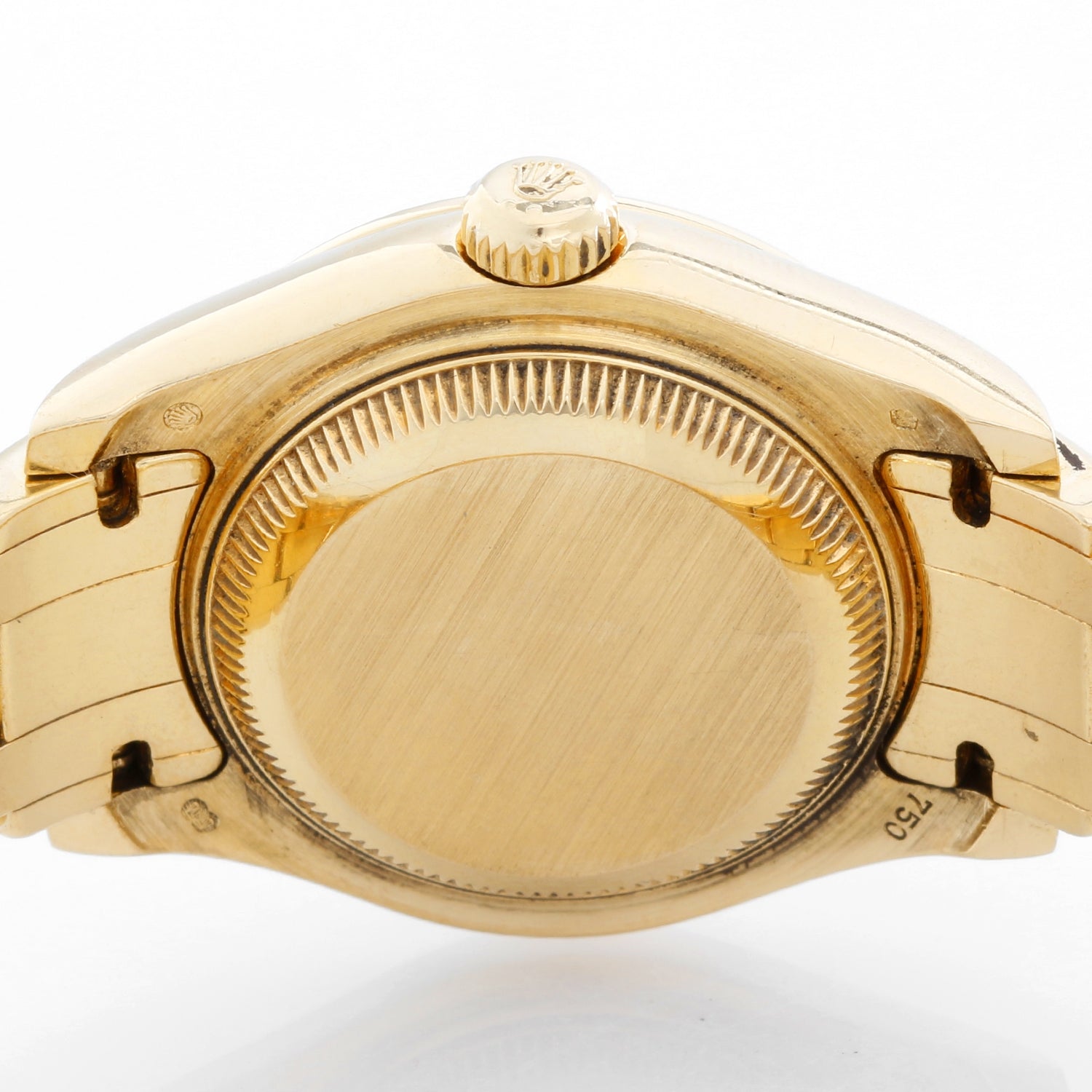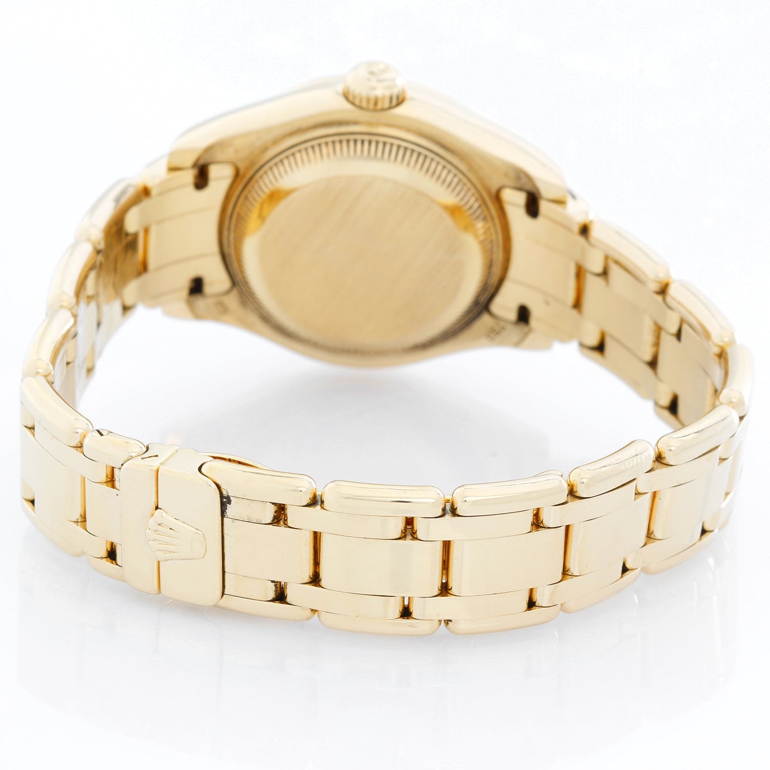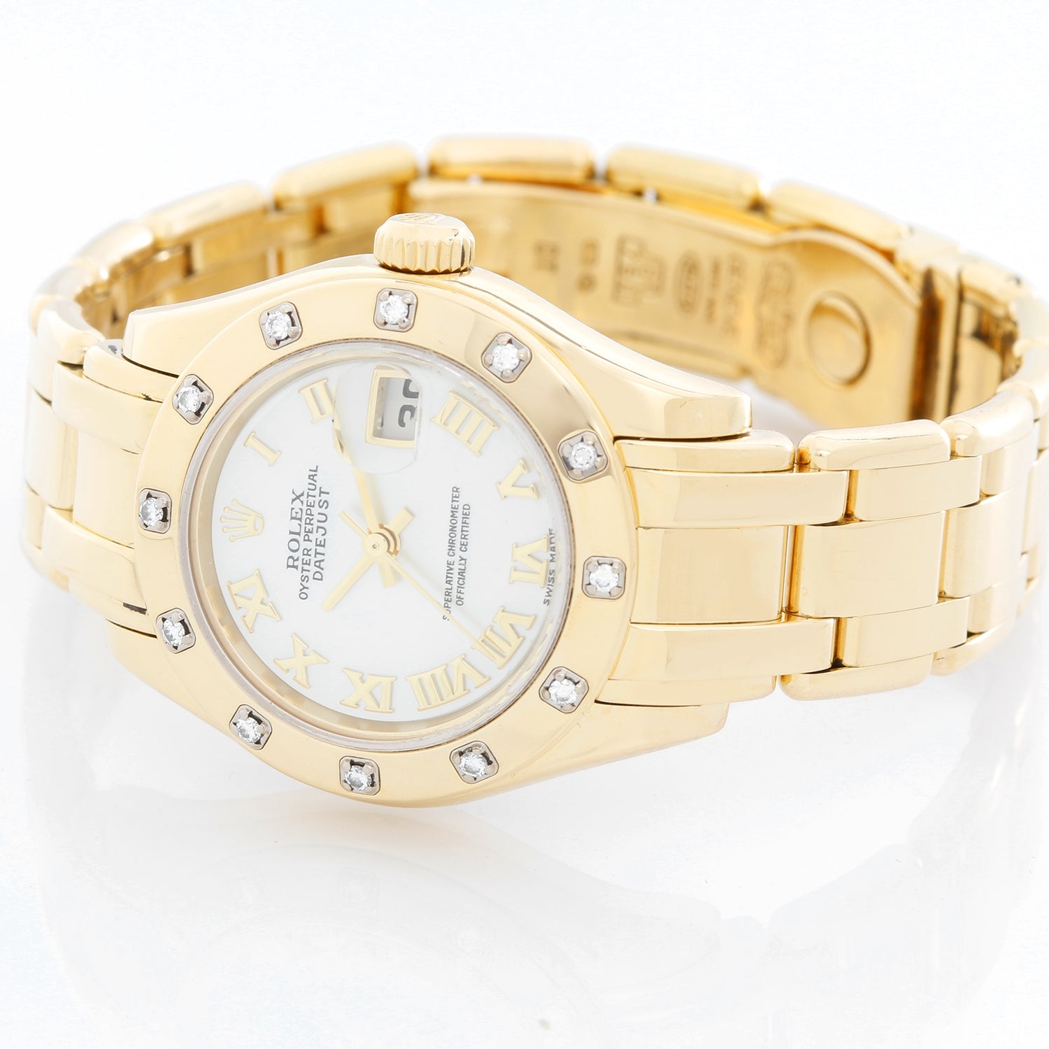 Rolex Lady Datejust Pearlmaster 18k Yellow Gold Ladies Diamond Watch 80318 Pre-owned - Automatic winding, 31 jewels, Quickset, sapphire crystal. 18k yellow gold Oyster style case with factory 12 diamond bezel (29mm diameter). Factory Mother of Pearl dial with gold Roman numerals. 18k yellow gold Pearlmaster bracelet. Pre-owned with box and books.