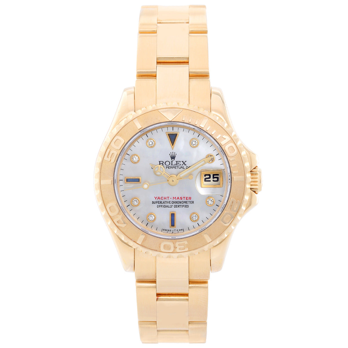Rolex Lady Yacht-Master, Model 69628 - Ladies 18k yellow gold wristwatch with 18k yellow gold rotating bezel (29mm diameter). Genuine Rolex mother of Pearl dial with diamond and sapphire hour markers. 18k yellow gold Oysterlock bracelet with flip-lock clasp. Pre-owned with box and papers