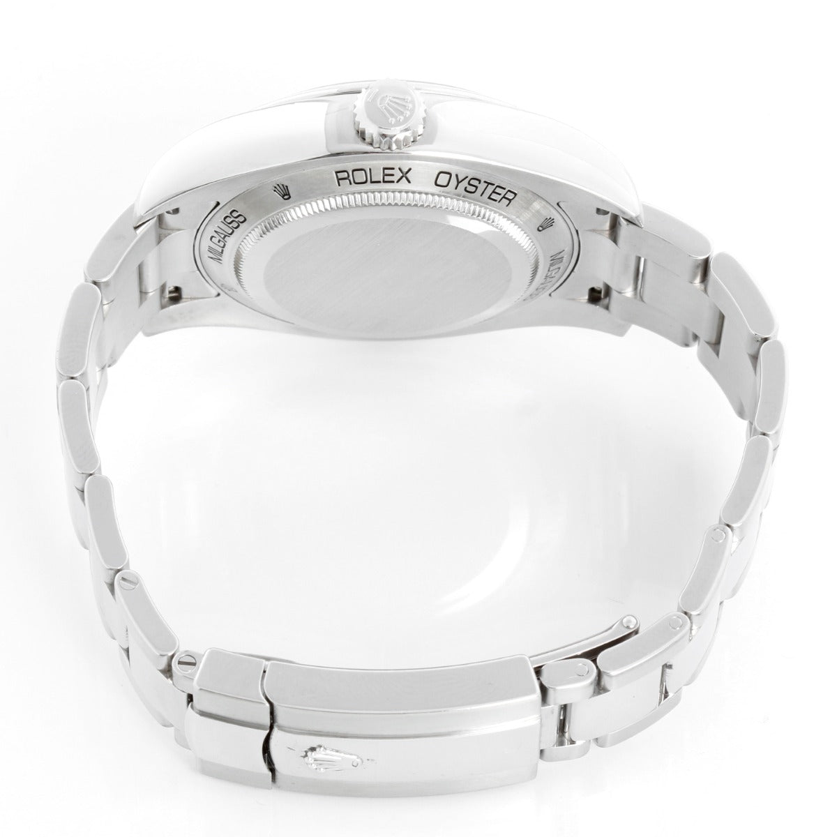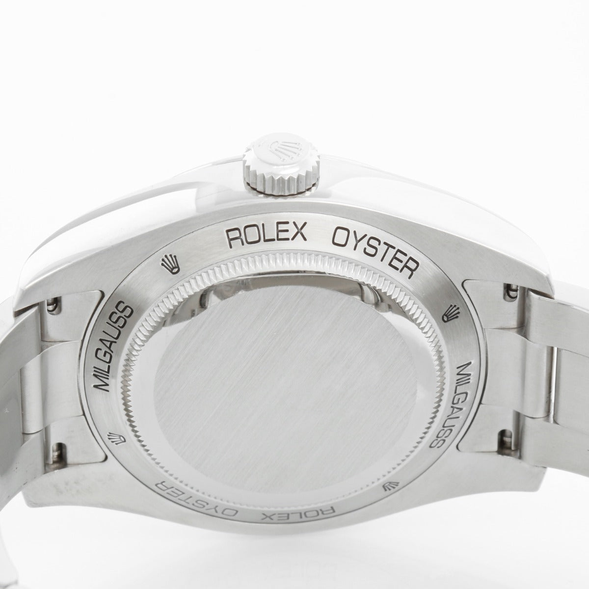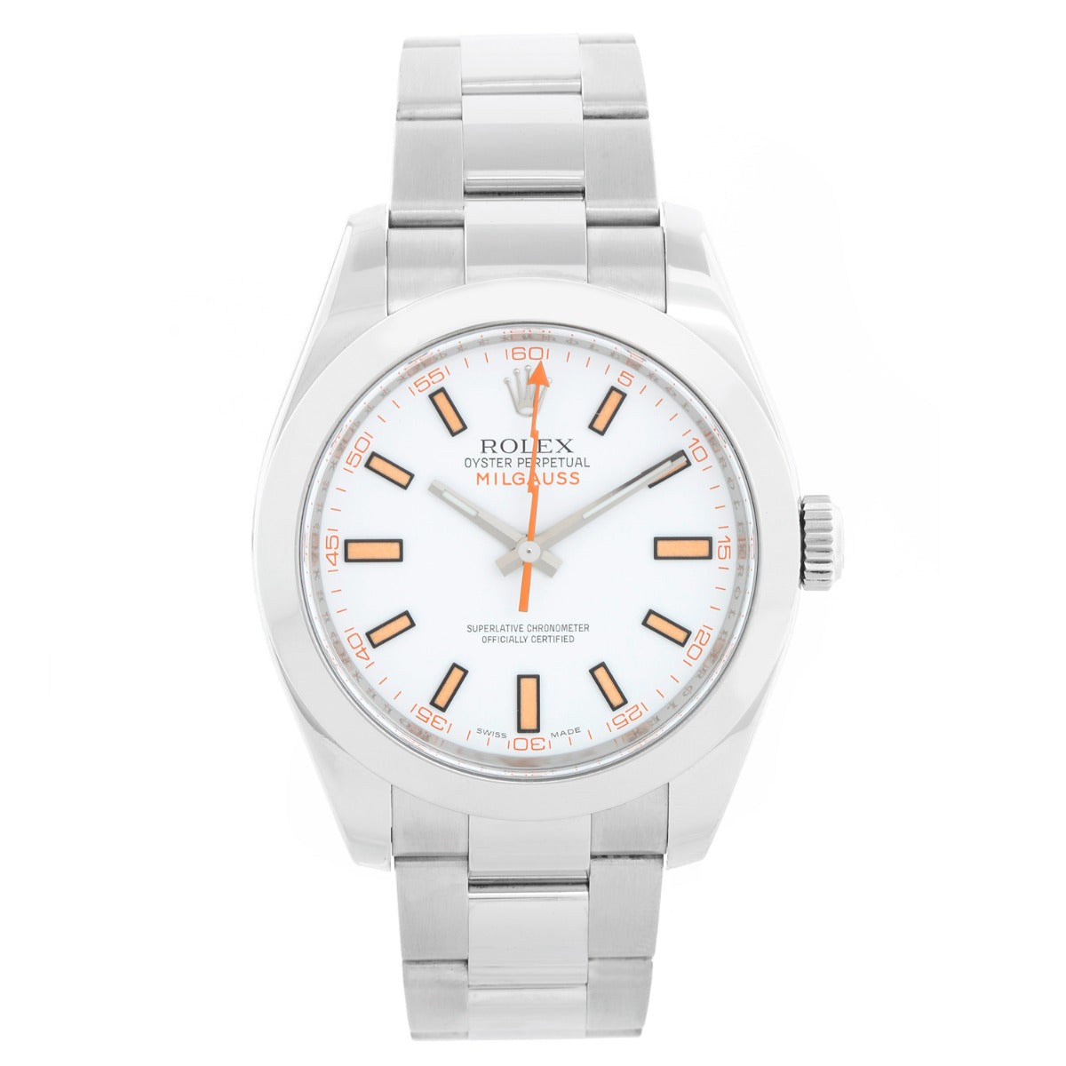 Rolex Milgauss Stainless Steel Men's Watch White Dial 116400 - Automatic winding, sapphire crystal, 31 jewels. Stainless steel case with smooth bezel (40mm diameter). White dial with luminous-style orange markers. Stainless steel Oyster bracelet with flip-lock clasp. Pre-owned with Rolex travel box and books.