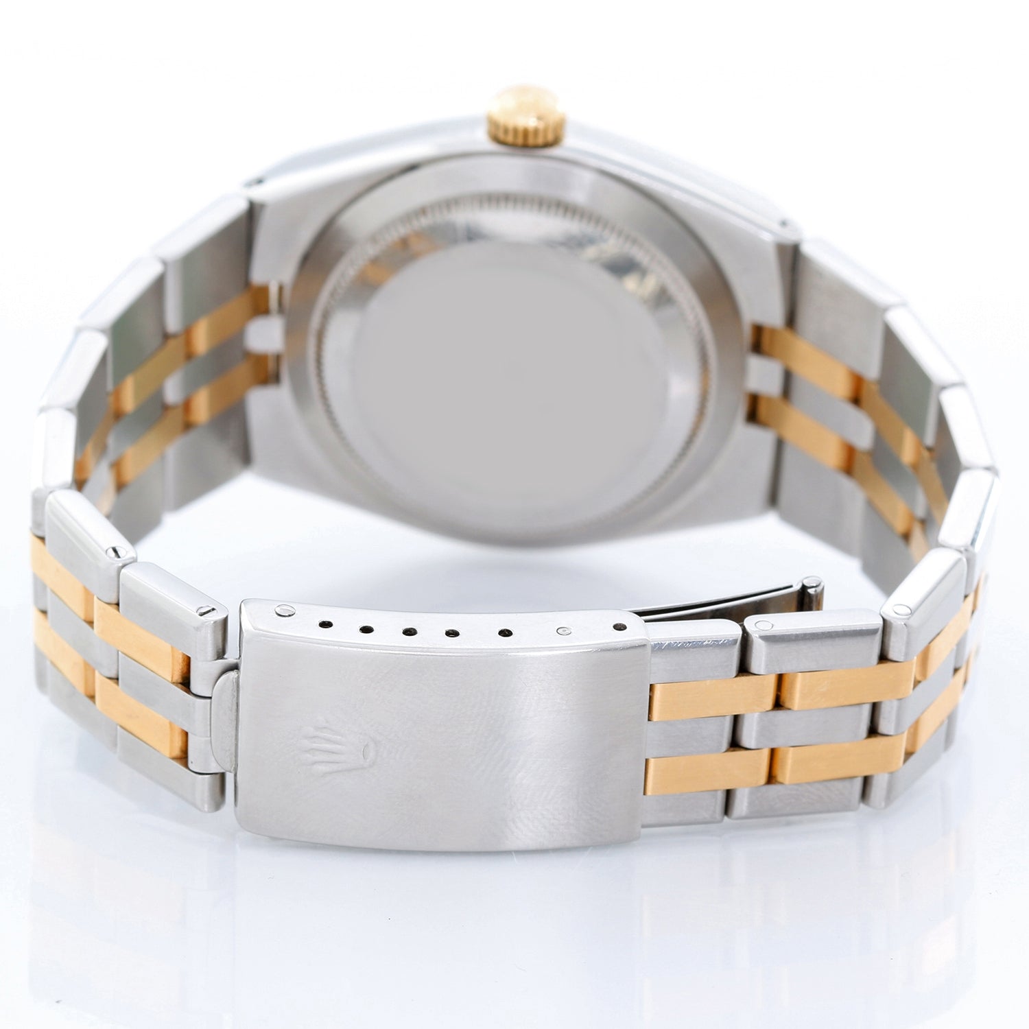 Rolex Datejust, Model 17013, - Men's stainless steel wristwatch with calendar. Stainless steel oyster case with yellow gold fluted bezel (35mm). Blue dial with stick markers. Steel and gold Rolex Oyster bracelet. Pre-owned with custom box