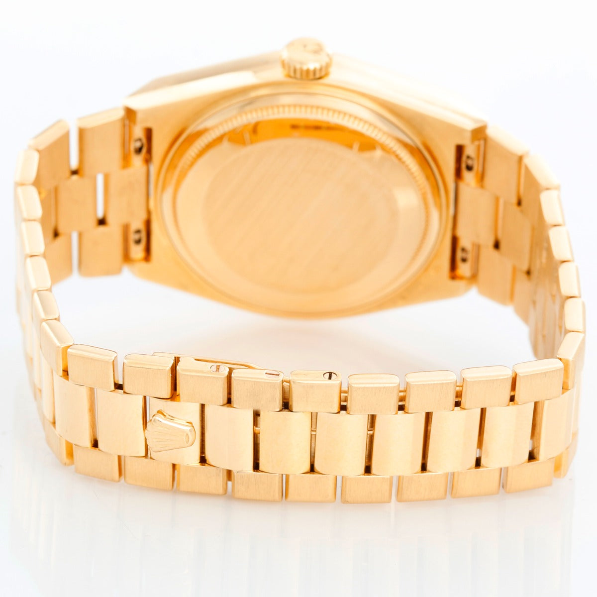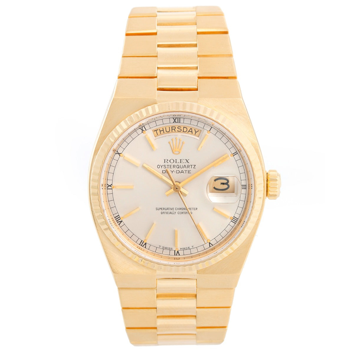 Rolex Oysterquartz Day-Date Men's 18K Gold President Watch 19018 - Quartz; quick-set; sapphire crystal. 18k yellow gold case with fluted bezel (36mm diameter). Silver dial with stick hour markers . 18k yellow gold Oysterquartz hidden-clasp bracelet. Pre-owned with box and book.