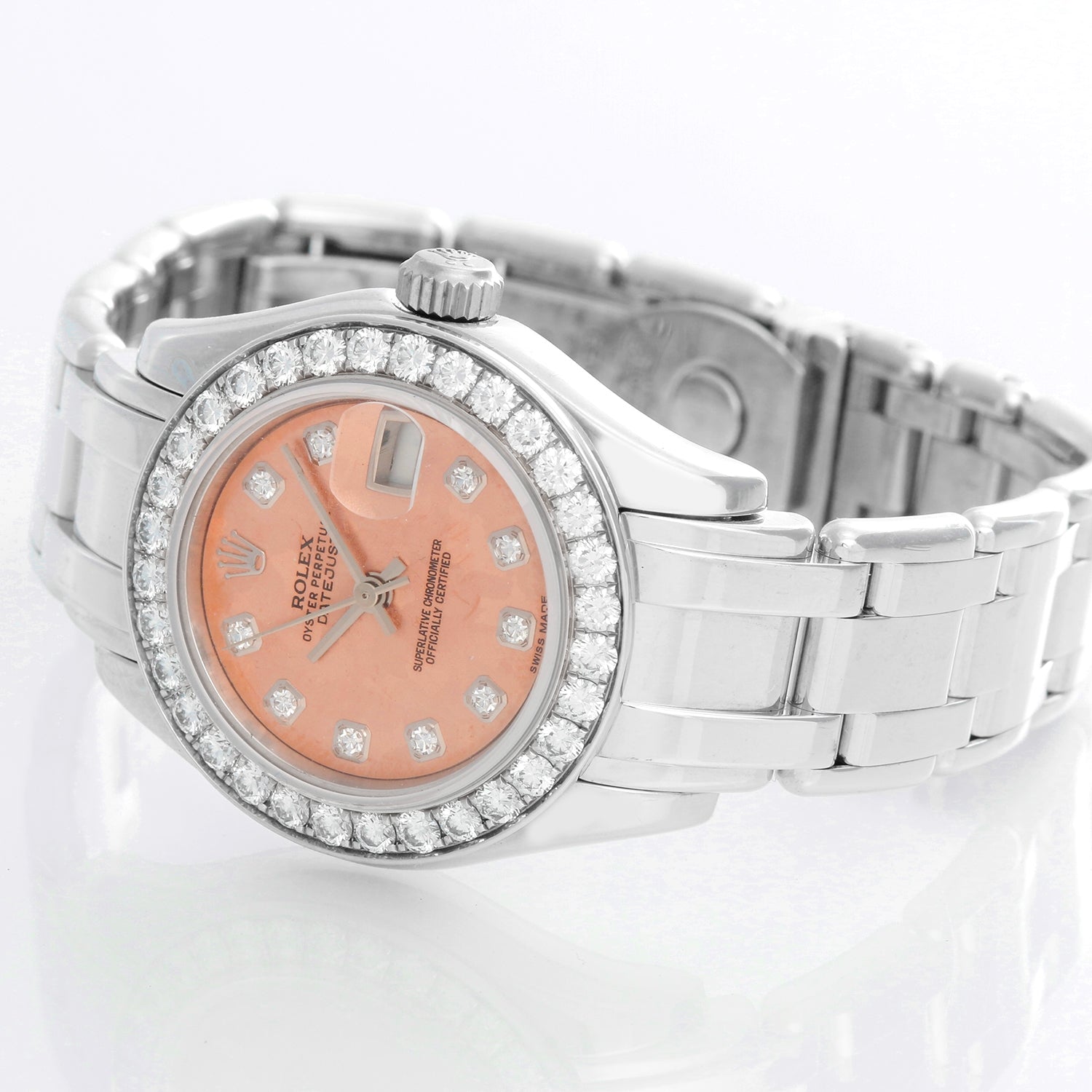 Rolex Ladies Pearlmaster 18k White Gold Watch 80299 - Automatic winding, 31 jewels, Quickset, sapphire crystal. 18k white gold case with factory 32-diamond bezel (29mm diameter). Pink gold crystal dial with diamond hour markers. 18k white gold Pearlmaster bracelet. Pre-owned with Rolex box and books.