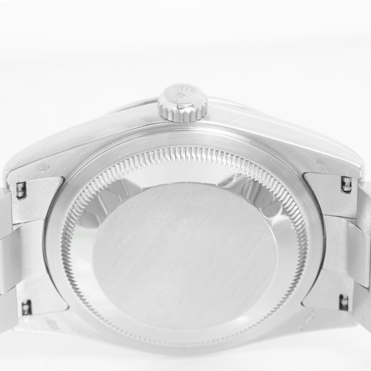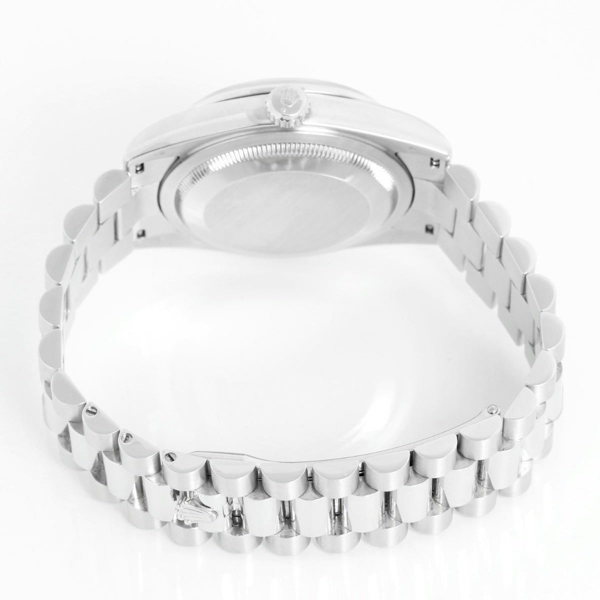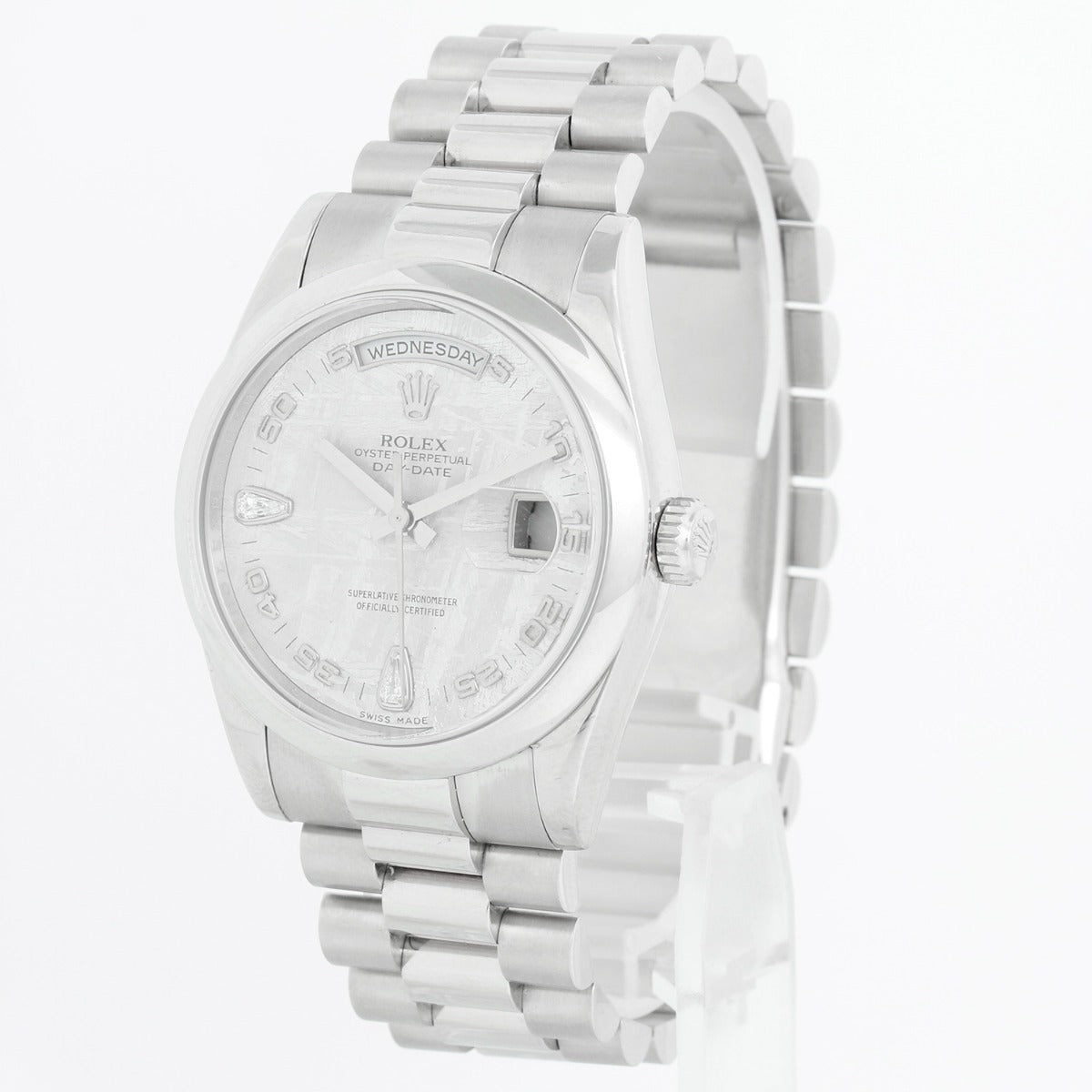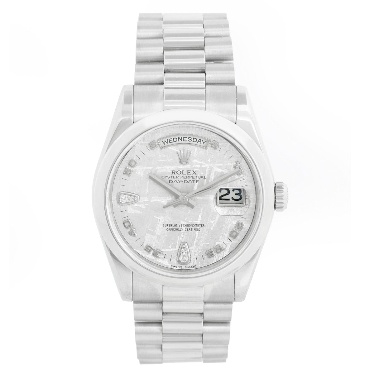 Rolex Platinum President Day-Date Men's Watch 118206 - Automatic winding, 31 jewels, Quickset, sapphire crystal. Platinum case with smooth bezel (36mm)and inner bezel rehaut engravings. Genuine Rolex meteorite dial with trapezoid diamonds at 6 & 9 o'clock. Platinum hidden clasp President bracelet with updated style heavy buckle . Pre-owned with Rolex box, books and card. Very hard to find with card stating 'Meteorite Dial'.