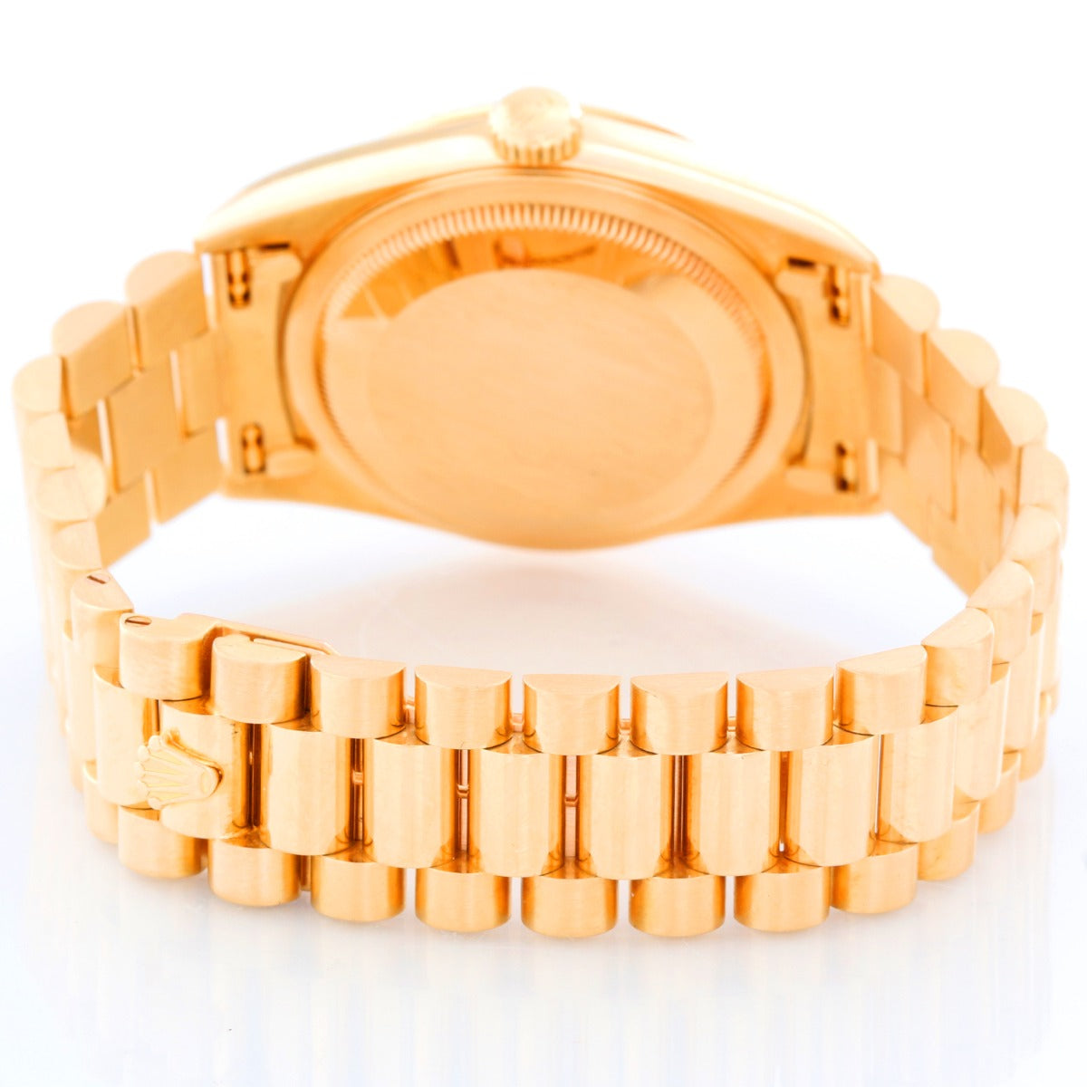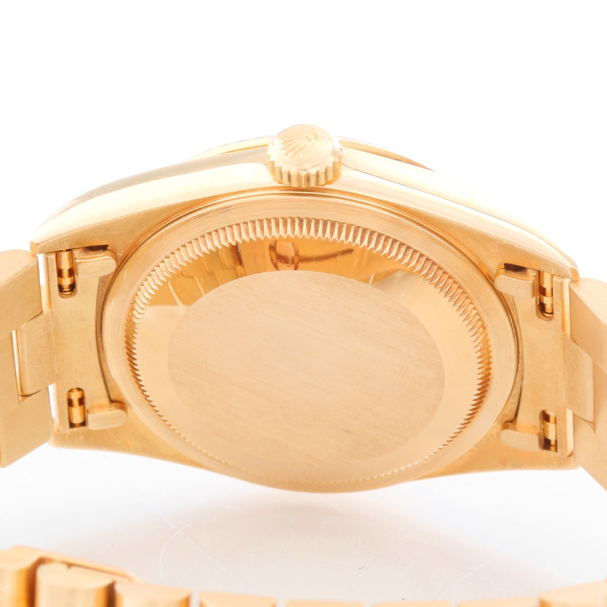 Men's Rolex President Day-Date Watch 18238 Automatic winding. 18k yellow gold case with fluted bezel (36mm diameter). Champagne dial with gold Roman numerals. Sapphire crystal. 18k yellow gold President Day-Date bracelet. Pre-owned with Rolex box and books.