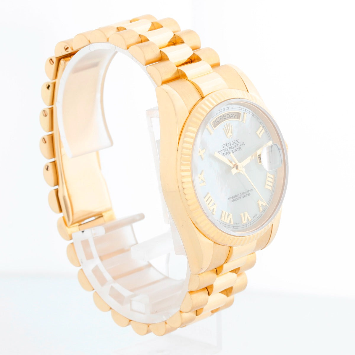 Rolex President Day-Date Men's 18k Gold Watch 118238 White Roman - Automatic winding, 31 jewels, Quickset, sapphire crystal. 18k yellow gold case with fluted bezel (36mm diameter). Mother of pearl dial with raised gold Roman numerals. 18k yellow gold hidden-clasp President bracelet. Pre-owned with box and books.
