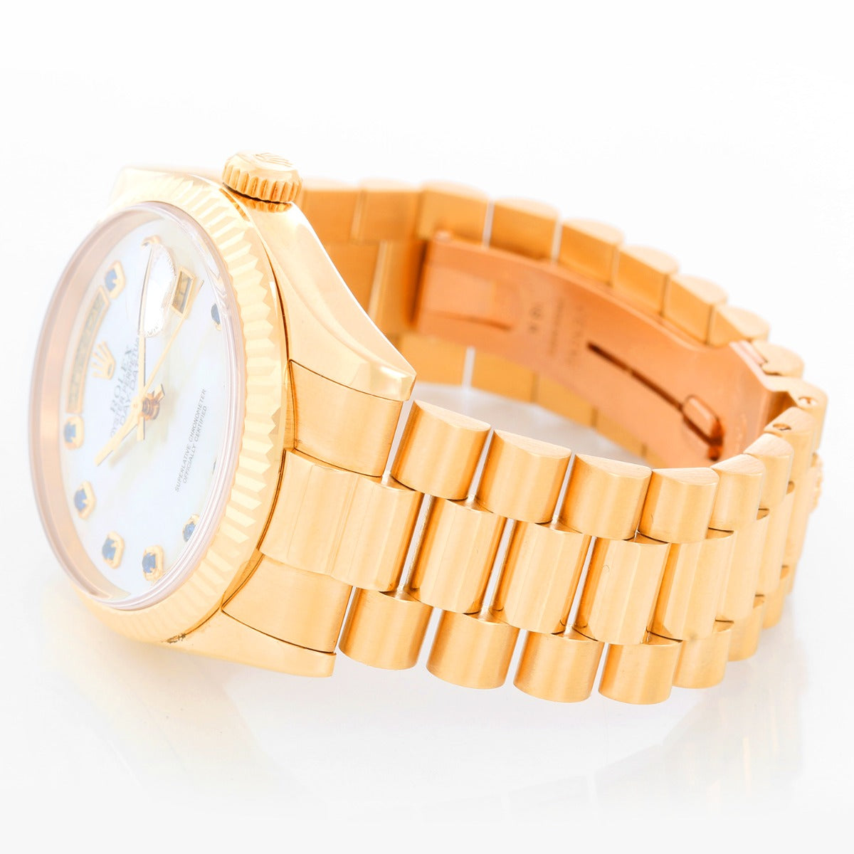 Rolex President Day-Date Men's Watch 118238 - Automatic winding, 31 jewels, Quickset, sapphire crystal. 18k yellow gold case ( 36 mm ) . Factory Mother of Pearl Sapphire Dial. 18k yellow gold hidden-clasp President bracelet. Pre-owned with Rolex box and books.
