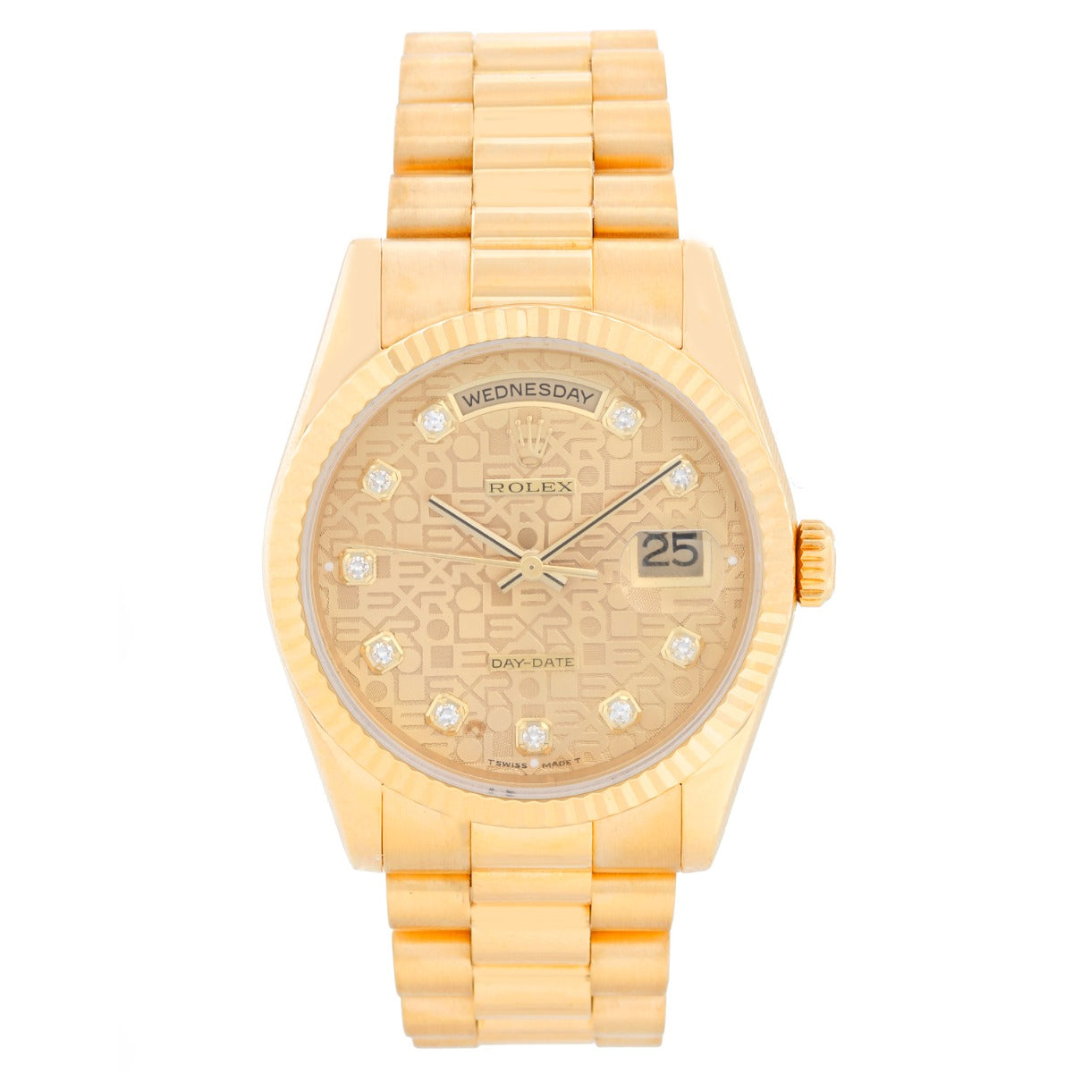 Rolex President Day-Date Men's 18k Gold Watch Jubilee Diamond Dial 118238 - Automatic winding, 31 jewels, Quickset, sapphire crystal. 18k yellow gold case with fluted bezel (36mm diameter). Factory champagne Jubilee diamond dial. 18k yellow gold hidden-clasp President bracelet. Pre-owned with box and books.