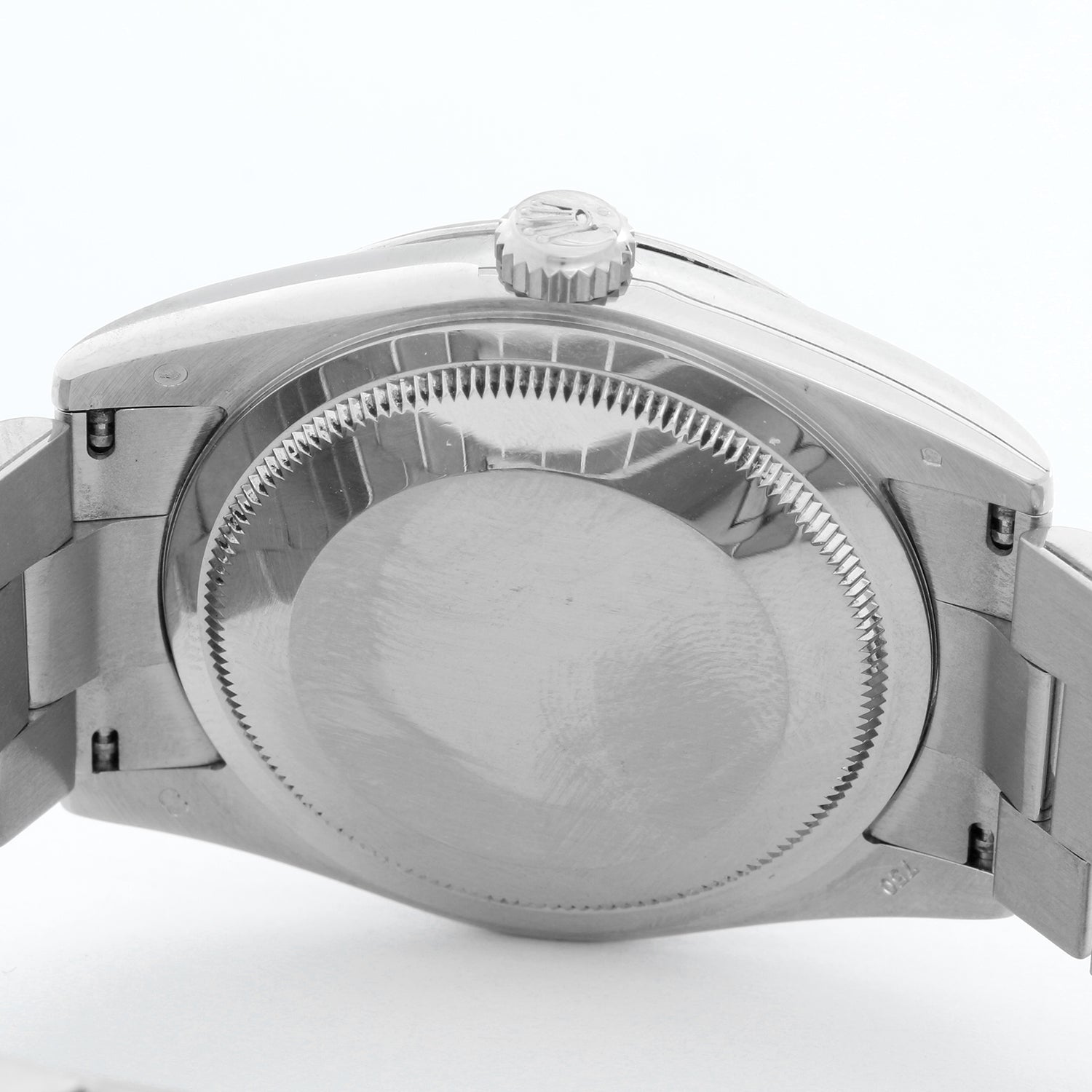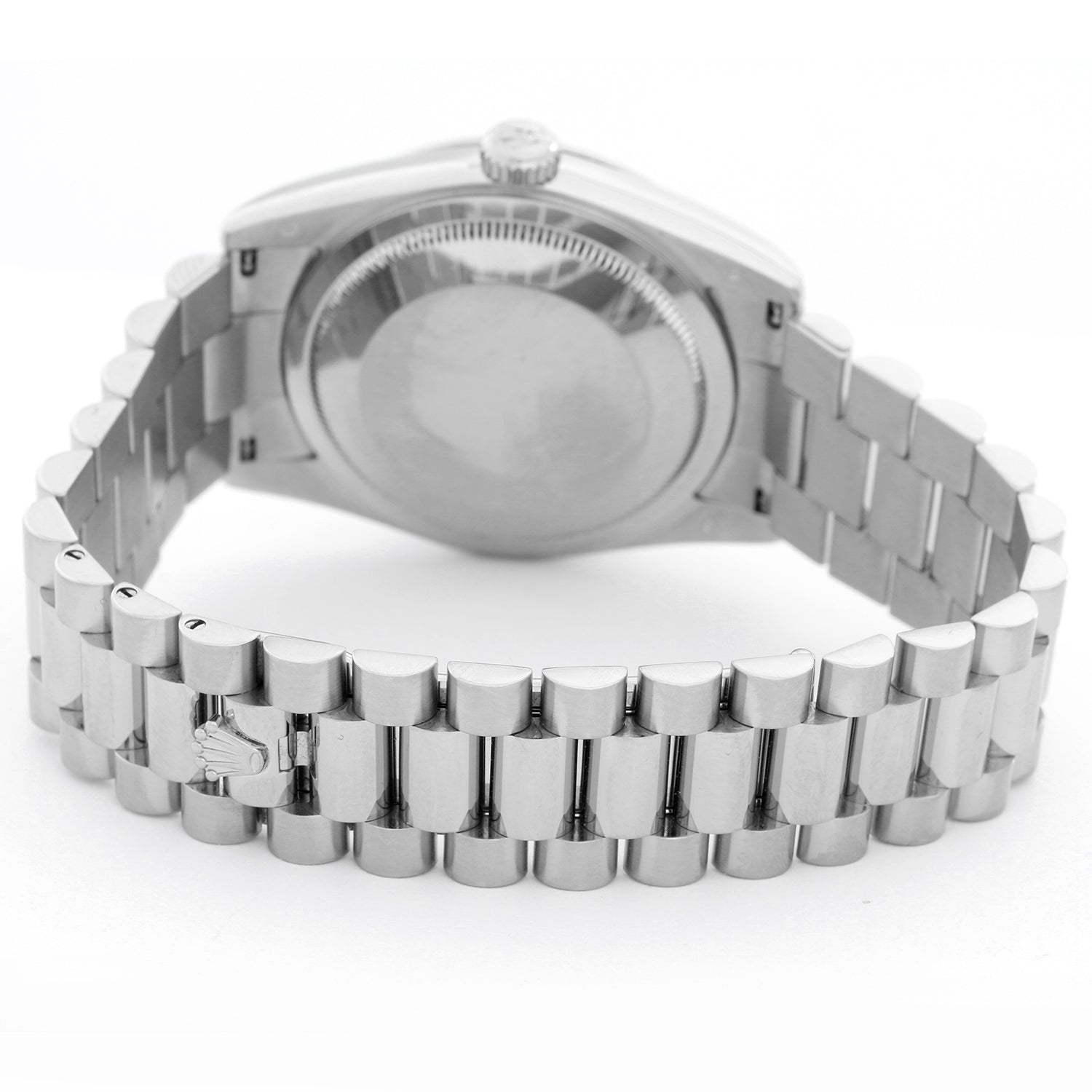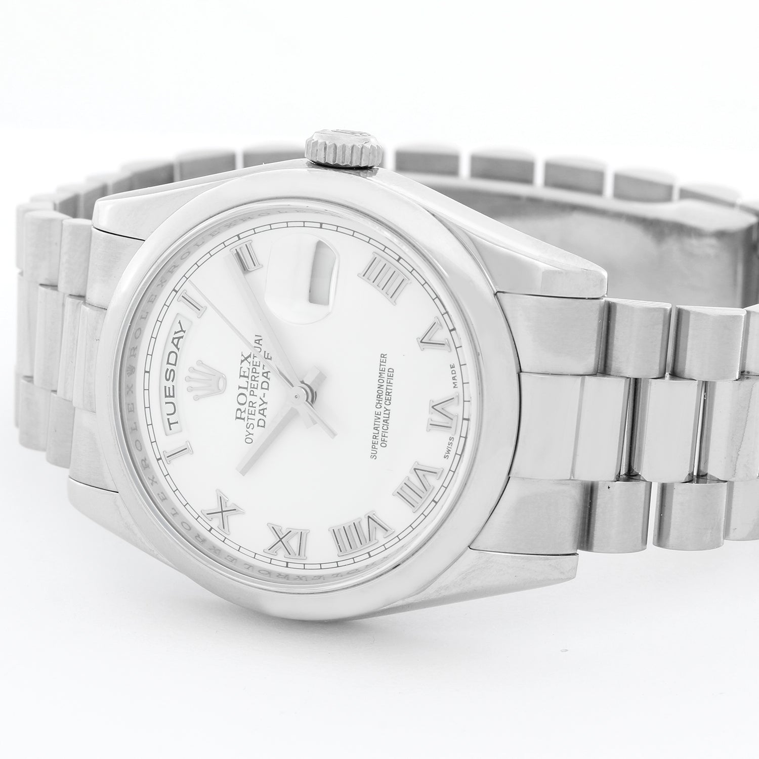 Rolex President Day-Date Men's 18k White Gold Watch 118209 - Automatic winding, 31 jewels, Quickset, sapphire crystal. 18k white gold case with smooth bezel (36mm diameter). White dial with Roman numerals . 18k white gold hidden clasp Oyster bracelet. Pre-owned with Rolex box and book.