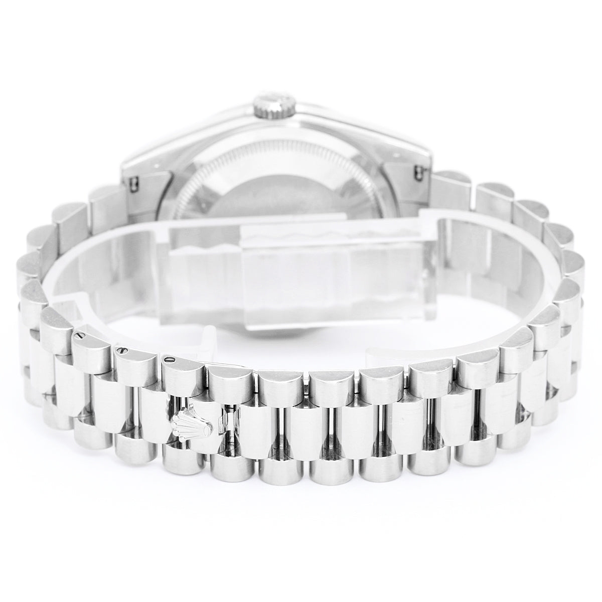Rolex President Day-Date Men's 18k White Gold Watch 118239 - Automatic winding, 31 jewels, Quickset, sapphire crystal. 18k white gold case with fluted bezel (36mm diameter). Genuine Rolex meteorite dial with trapezoid diamonds at 6 & 9 o'clock. 18k white gold hidden-clasp President bracelet. Pre-owned with Rolex box and books.