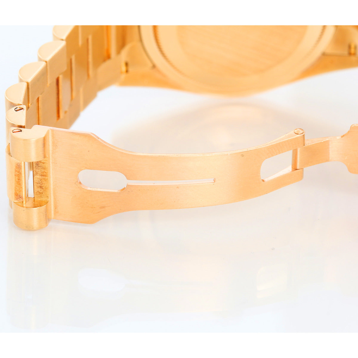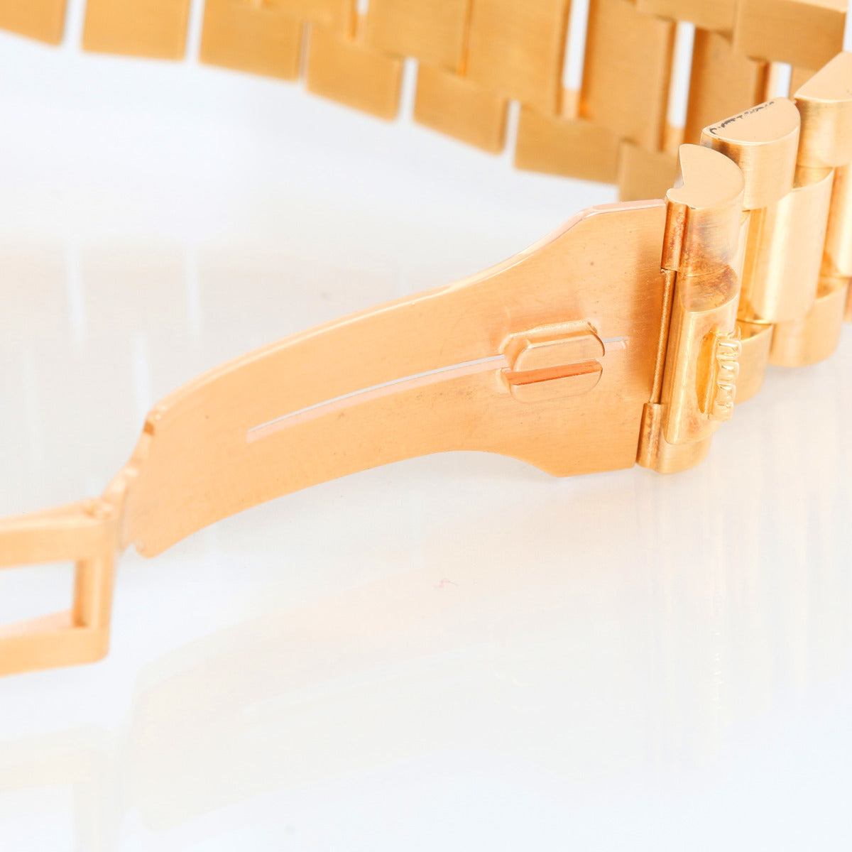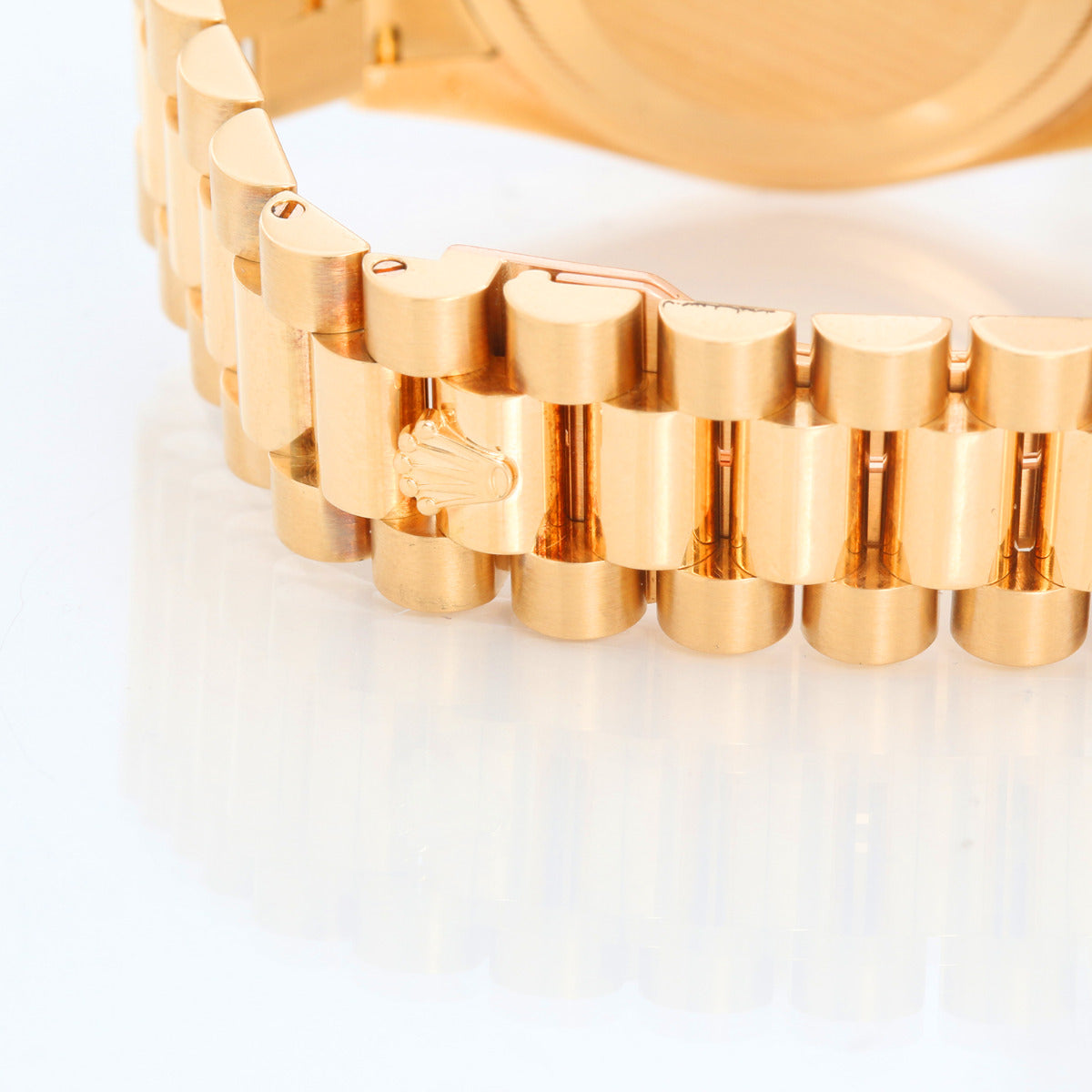 Rolex President Day-Date Men's 18k Yellow Gold Watch 118238 - Automatic winding, 31 jewels, Quickset, sapphire crystal. 18k yellow gold case with fluted bezel (36mm diameter). White dial with Roman numerals. 18k yellow gold hidden-clasp President bracelet. Pre-owned with Rolex box and books.