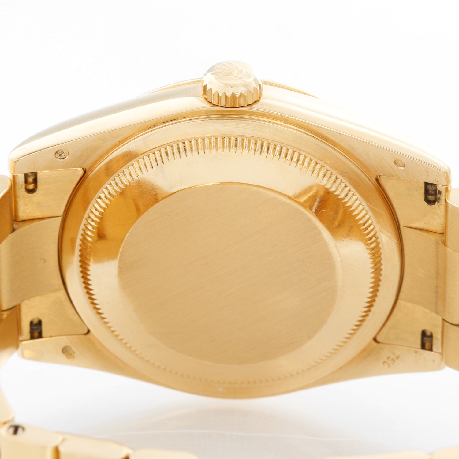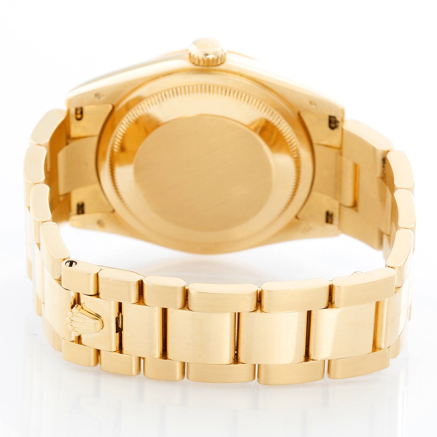 Rolex President Day-Date Men's Watch 118208 - Automatic winding, 31 jewels, Quickset, sapphire crystal. 18k yellow gold case with smooth bezel (36 mm). Factory Meteorite diamond dial. 18k yellow gold Oyster bracelet with new style polished buckle. Pre-owned with box and books.