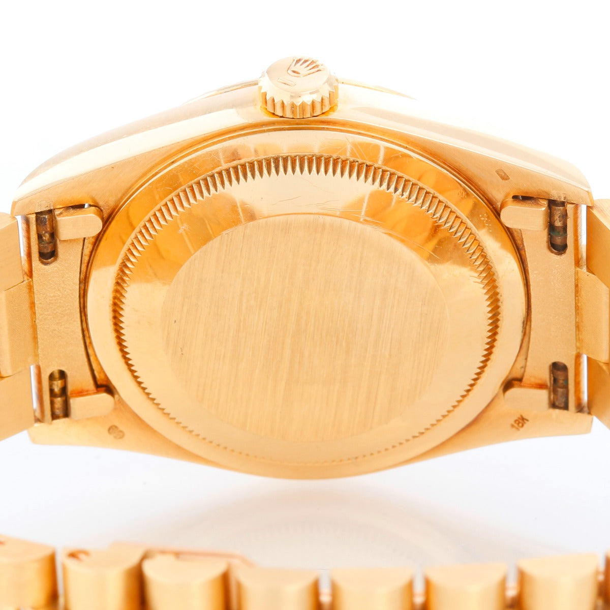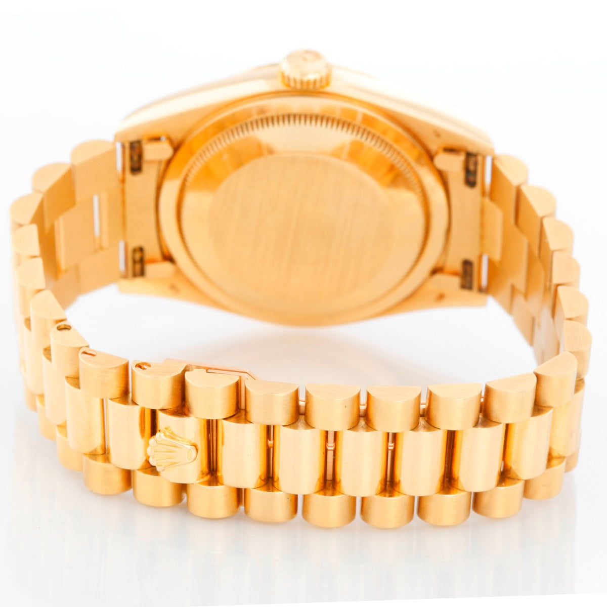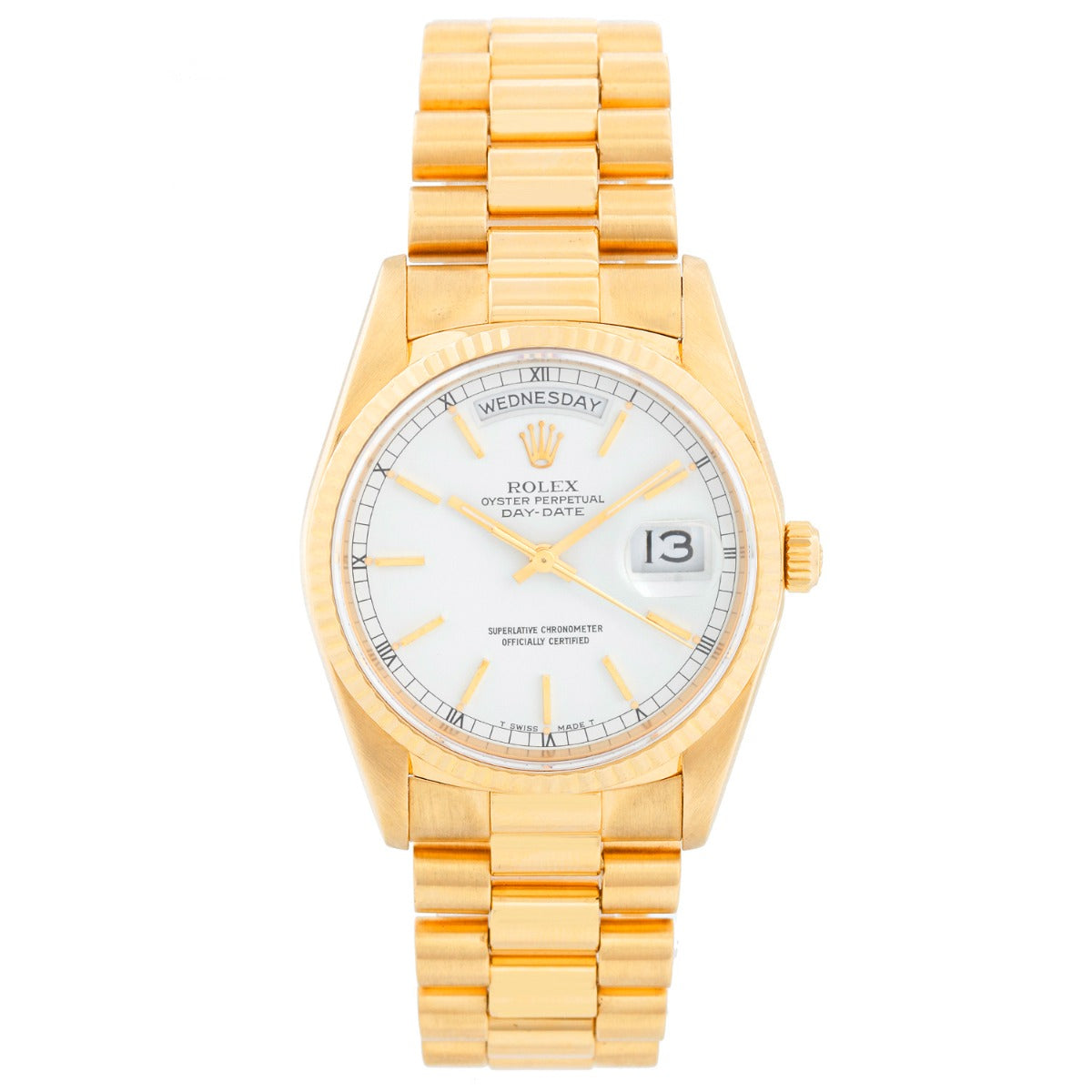 Rolex President Day-Date Model 18238, - Men's automatic winding wristwatch. 18k yellow gold case with fluted bezel (36mm diameter). White dial with gold stick markers. 18k yellow gold hidden-clasp President Day-Date bracelet. Pre-owned with Rolex box and books.