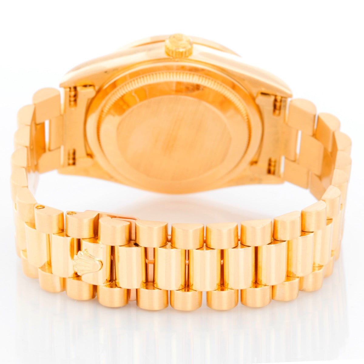 Rolex President Day-Date Men's Yellow Gold Watch Factory Dial 18348 - Automatic winding, 31 jewels, Quickset, sapphire crystal. 18k yellow gold case with factory diamond bezel (36mm diameter). Factory blue vignette dial. 18k yellow gold hidden-clasp President bracelet. Pre-owned with box and books.