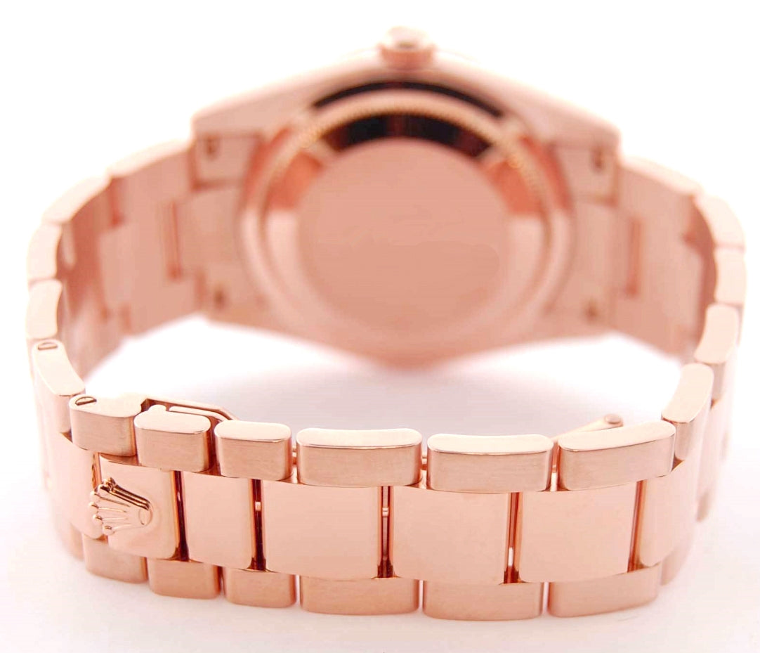 Rolex President Day-Date Roman Dial Rose Gold Men's Watch 118235 - Automatic winding, 31 jewels, Quickset, sapphire crystal. 18k rose gold case with fluted bezel (36mm diameter). Rolex rose Roman dial. 18k rose gold Oyster bracelet with new style deployant clasp. Pre-owned with box and books.