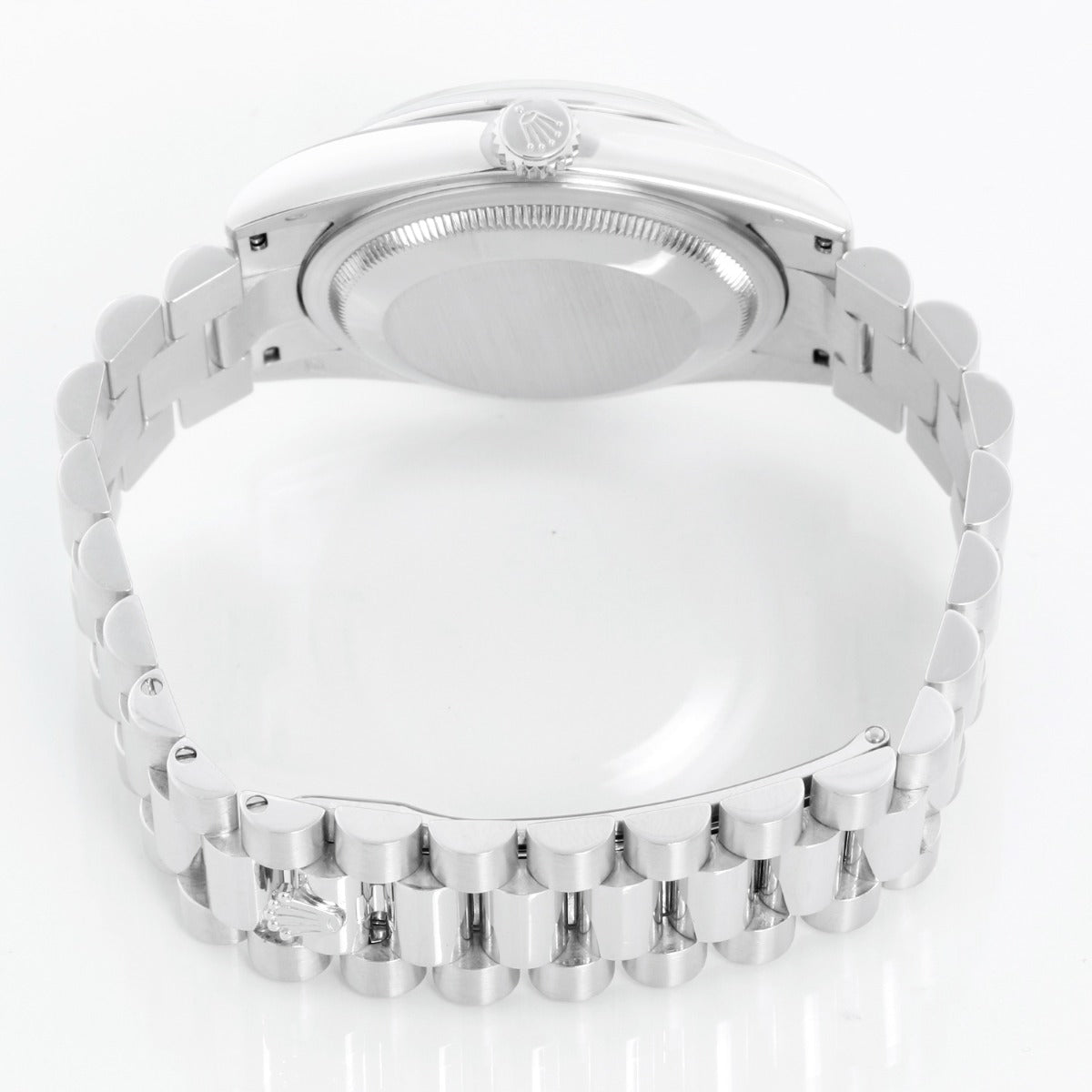 Rolex President - Model 118206, Day-Date - Men's platinum wristwatch (36mm diameter) with sapphire crystal and smooth bezel. Glacier Blue Wave Dial. Platinum hidden clasp President bracelet; new style buckle . Pre-owned with box and books