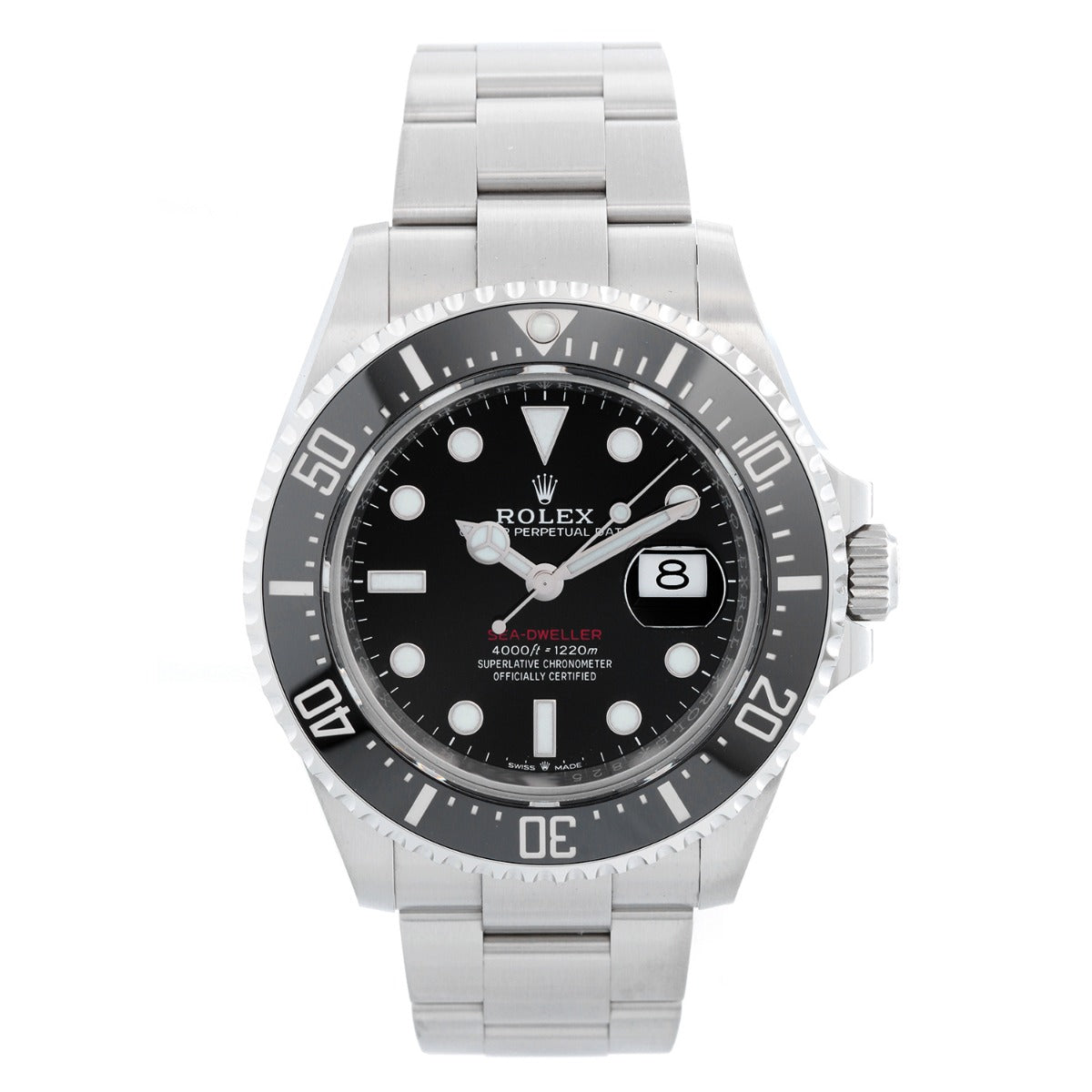 Rolex "Red" Sea-Dweller 43 126600 50th Anniversary Men's Watch - Automatic winding, 31 jewels, sapphire crystal, Water resistant at 1200 meters / 4000 feet.. Stainless steel case with Ringlock System, rotatable black ceramic bezel, gas escape valve, (43mm diameter). Black dial with luminous markers; date at 3 o'clock. Updated Oyster bracelet with flip-lock clasp. Pre-owned with Rolex box and card