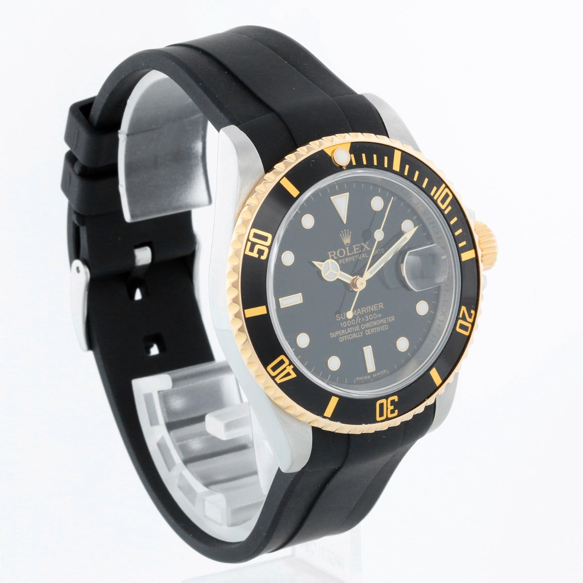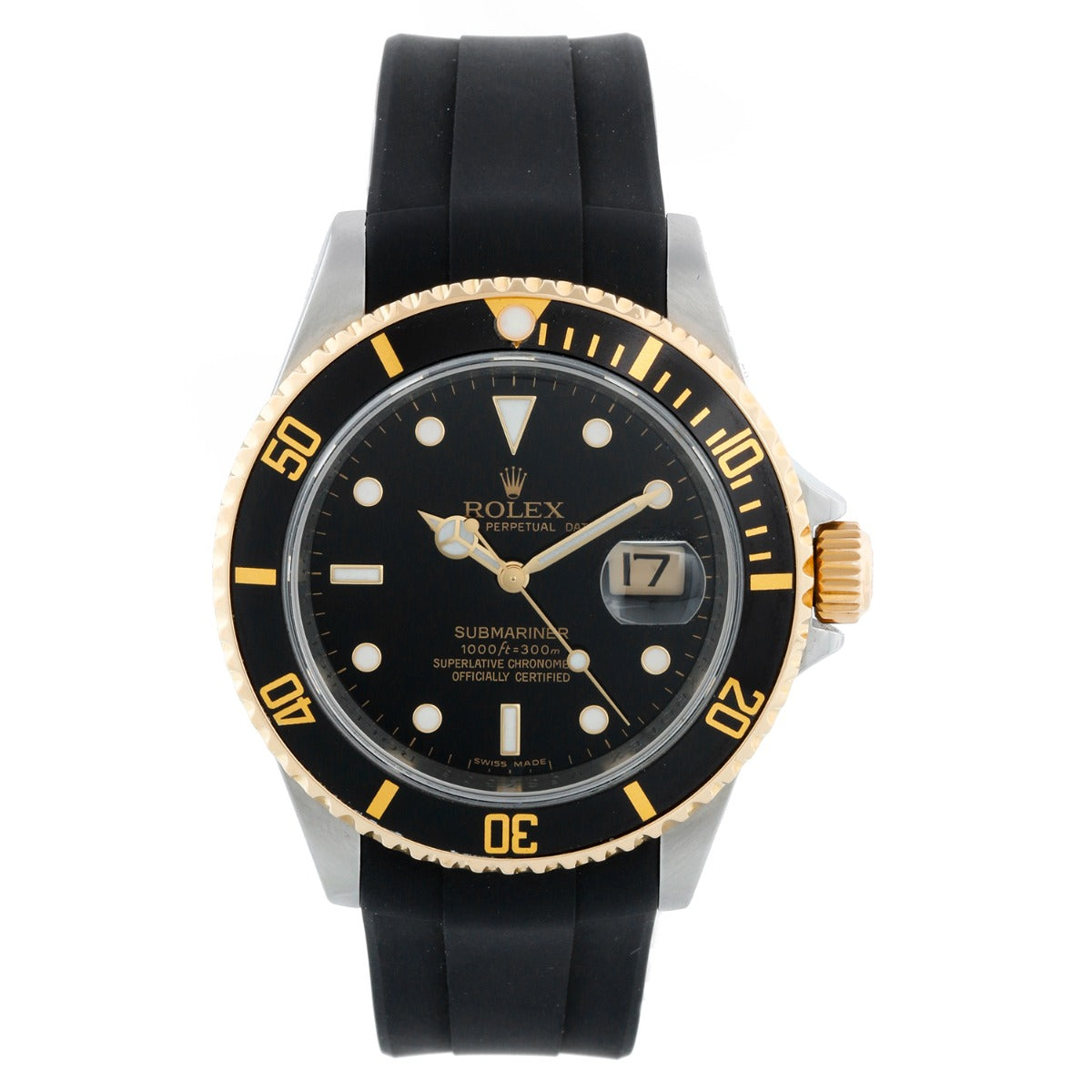Rolex Submariner 2-Tone Steel & Gold Men's Watch 16613 - Automatic winding, 31 jewels, pressure proof to 1,000 feet. Stainless steel case with 18k yellow gold bezel (40mm diameter). Black dial with luminous markers; date at 3 o'clock. Black Rubber strap with a tang buckle & Two tone Oyster bracelet. Pre-owned with Rolex box,book and card