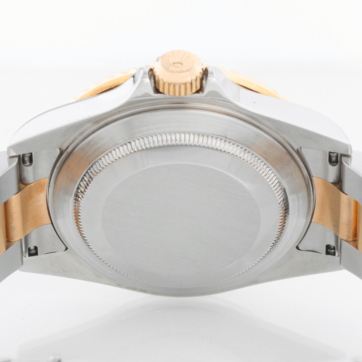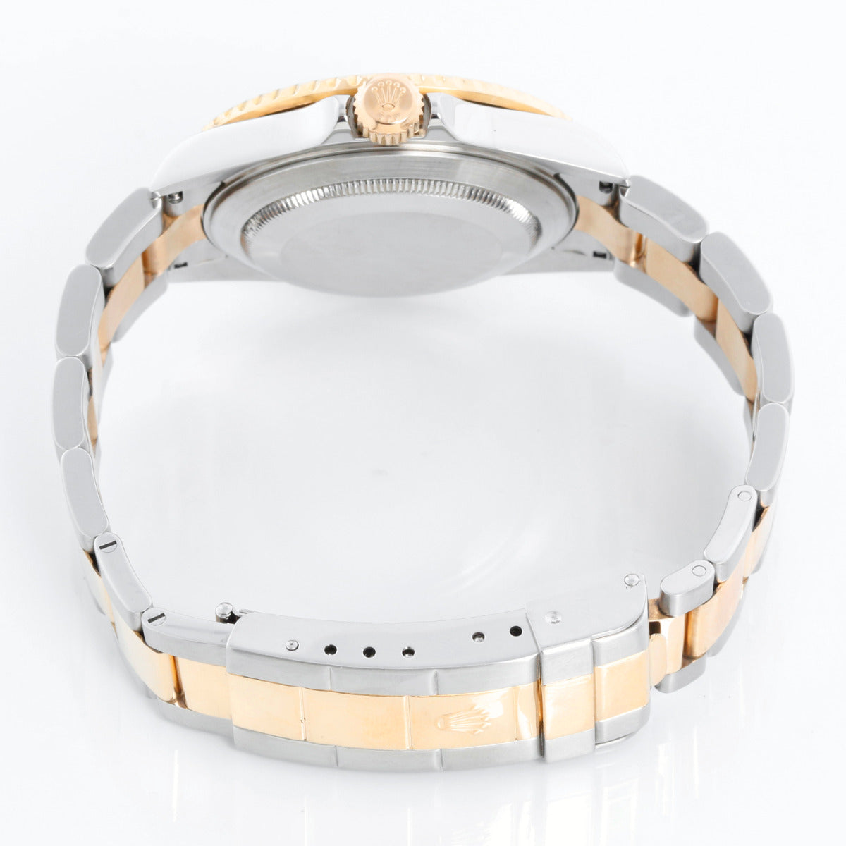 Rolex Submariner 2-Tone Steel & Gold Men's Watch 16613 - Automatic winding, 31 jewels, pressure proof to 1,000 feet. Stainless steel case with 18k yellow gold bezel (40mm diameter). Black dial with luminous markers; date at 3 o'clock. Rolex Two- tone Oyster bracelet. Pre-owned with Rolex box and books