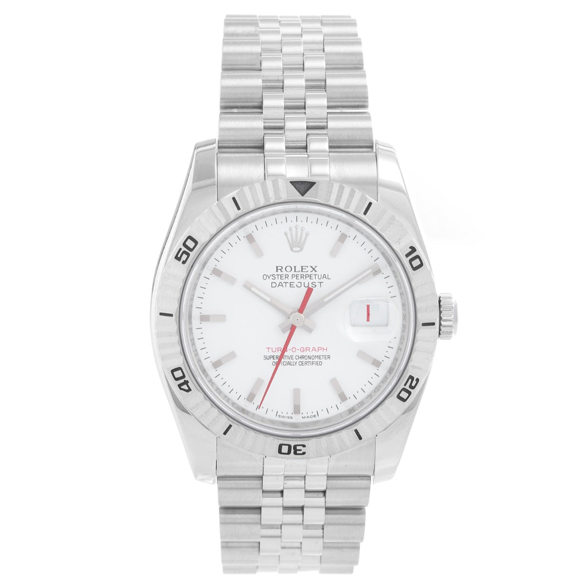 Rolex Turn-O-Graph Datejust Men's Stainless Steel Watch 116264 - Automatic winding, 31 jewel, sapphire crystal. Stainless steel case with 18k white gold fluted Turnograph bezel (36mm diameter). White dial with stick markers; red date and second hand. Stainless steel Jubilee bracelet with flip-lock clasp. Pre-owned with custom box