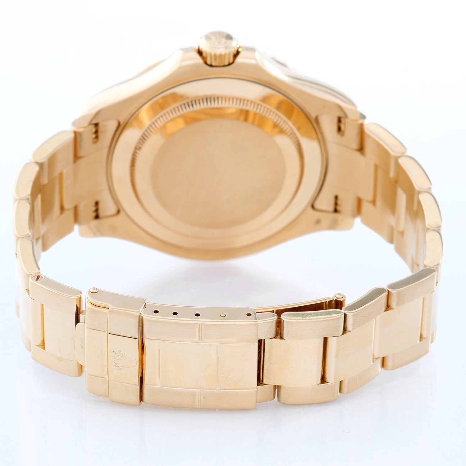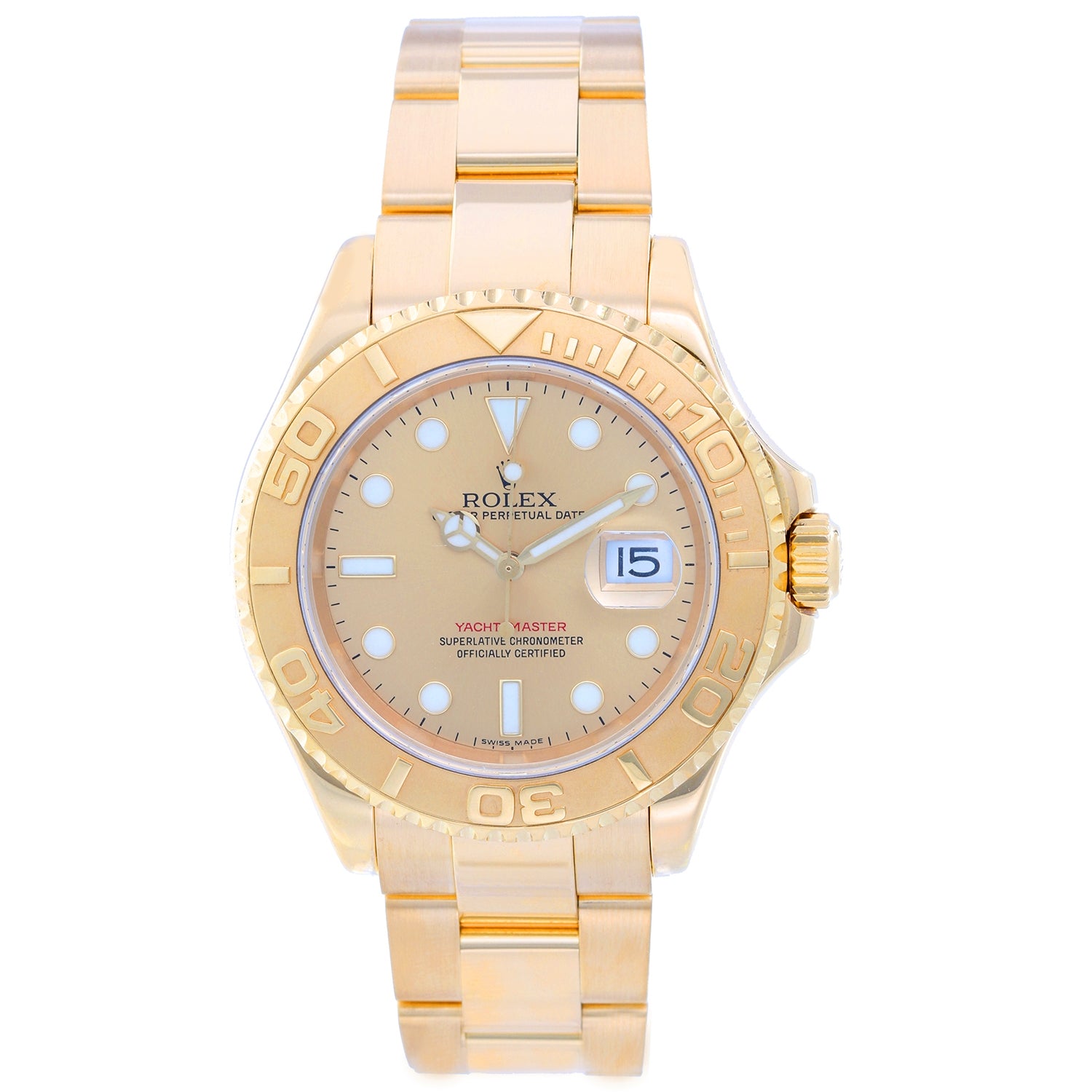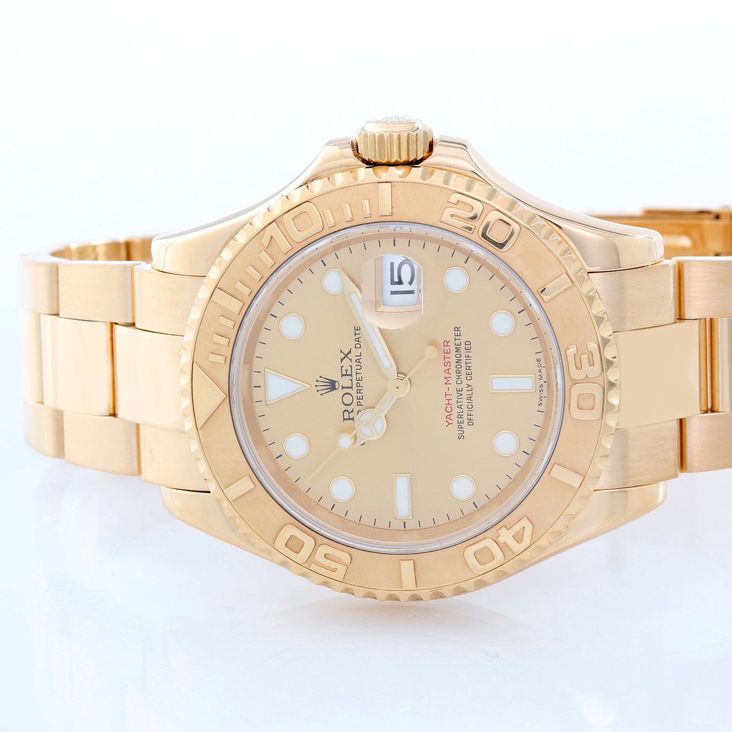 Rolex Yacht-Master Model 16628, Men's 18k yellow gold wristwatch with date display (40mm diameter). Quick set. Sapphire crystal. 18k yellow gold rotating bezel. Champagne dial with white markers. 18k yellow gold oyster bracelet with flip-lock clasp. 31 jewel superlative officially certified chronometer movement. Pre-owned with box and books.