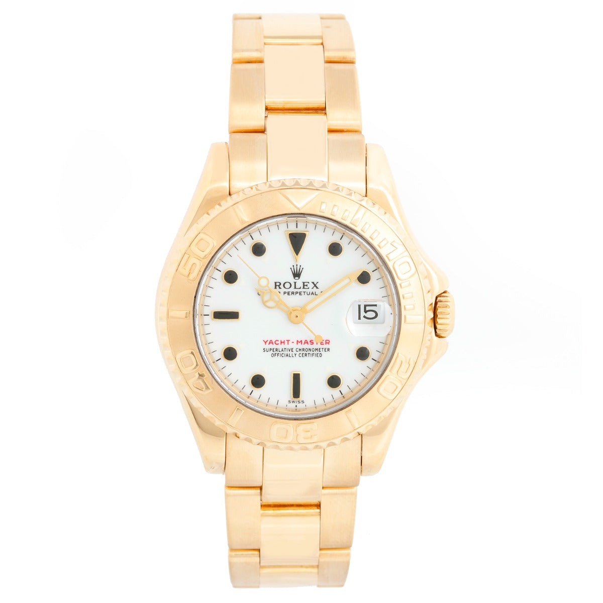 Rolex Yacht-Master Midsize Men's/Ladies 18k Gold Watch 68628 - Automatic winding, 29 jewels, sapphire crystal. 18k yellow gold case with rotating bezel (35mm diameter). White dial with black markers. 18k yellow gold Oyster bracelet with flip-lock clasp. Pre-owned with Rolex travel box