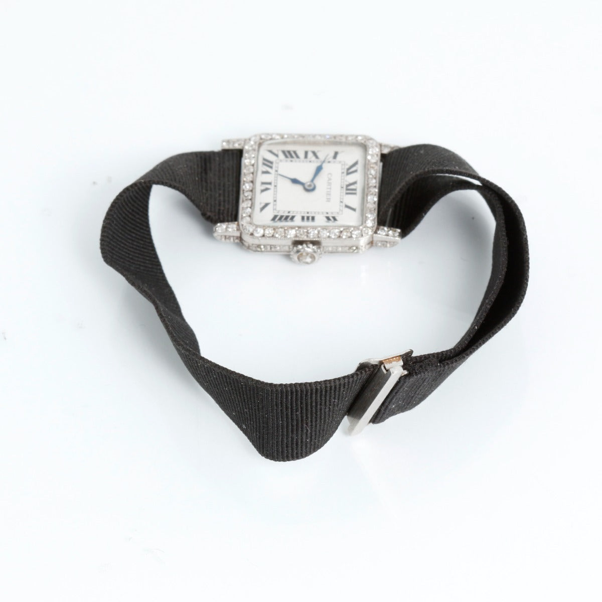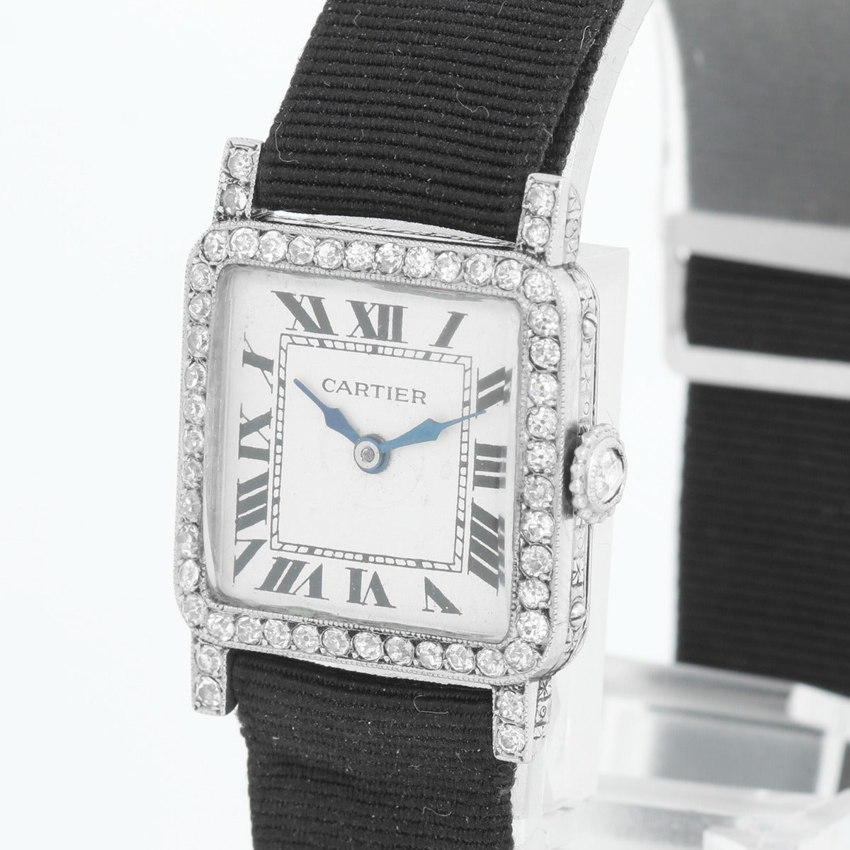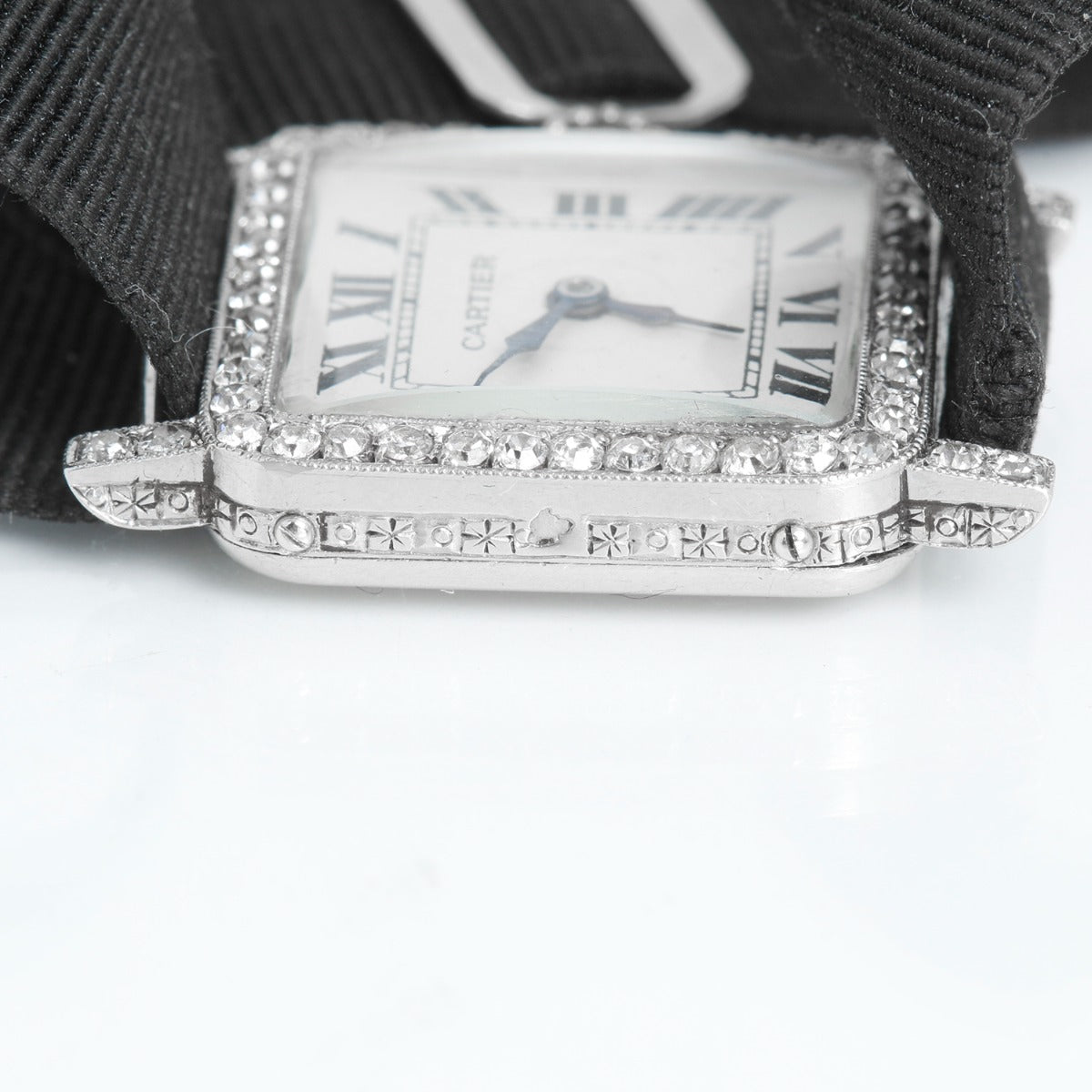 Very Rare & Collectable Cartier Paris Art Deco Platinum Diamond Ladies Watch - Manual winding. Platinum with diamond lugs and a diamond crown (21 x 27 mm). White dial with roman numerals. Black satin strap . Pre-owned with custom box. Circa 1920s-1930's .