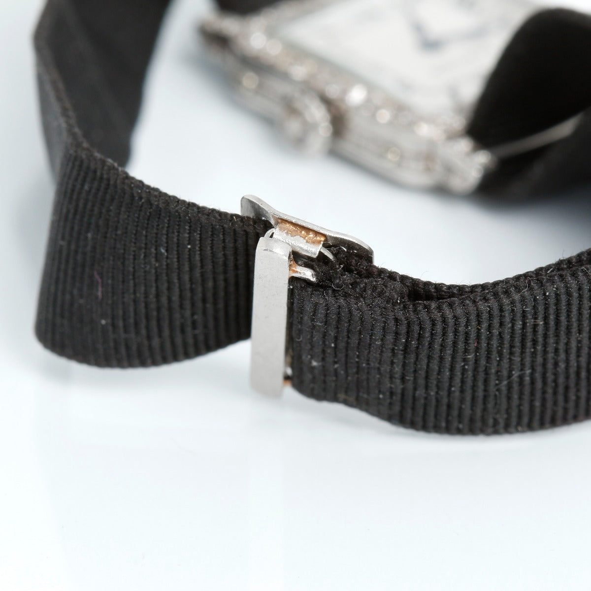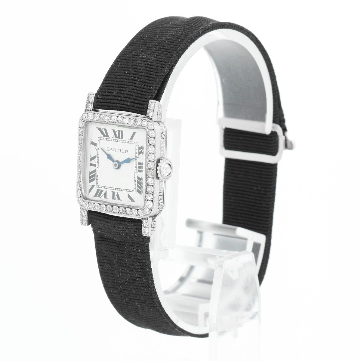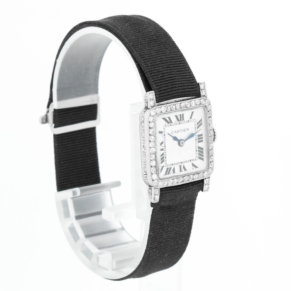 Very Rare & Collectable Cartier Paris Art Deco Platinum Diamond Ladies Watch - Manual winding. Platinum with diamond lugs and a diamond crown (21 x 27 mm). White dial with roman numerals. Black satin strap . Pre-owned with custom box. Circa 1920s-1930's .