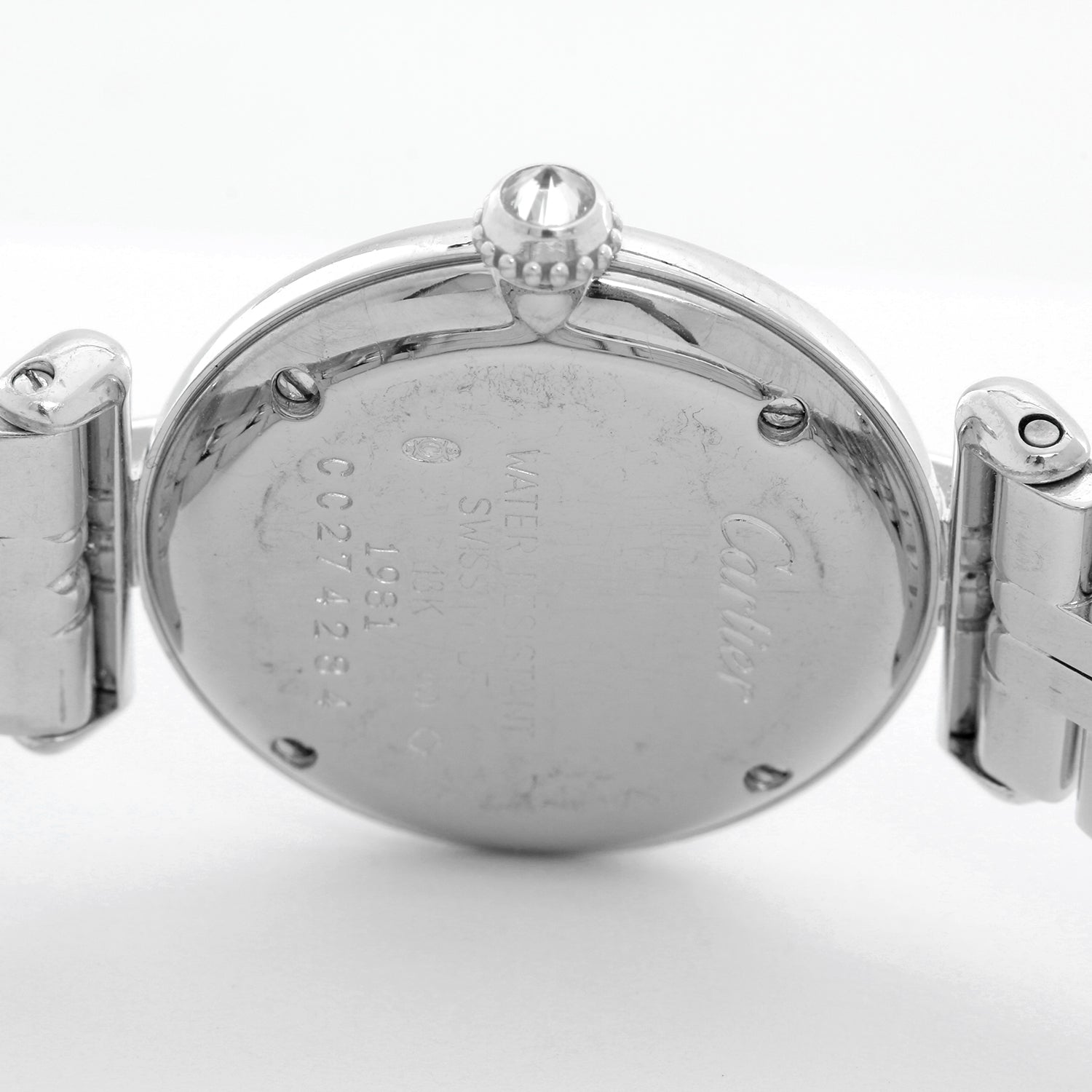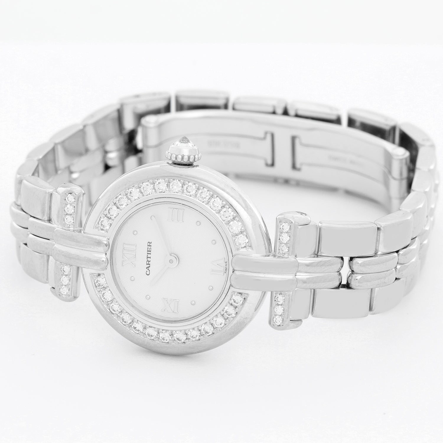 Cartier 18K White Gold Diamond Ladies Watch - Quartz. 18K White gold case ( 24 mm ); diamond bezel. Silver guilloche dial with Roman numerals. 18K White gold bracelet with diamond lugs. Pre-owned with custom box.