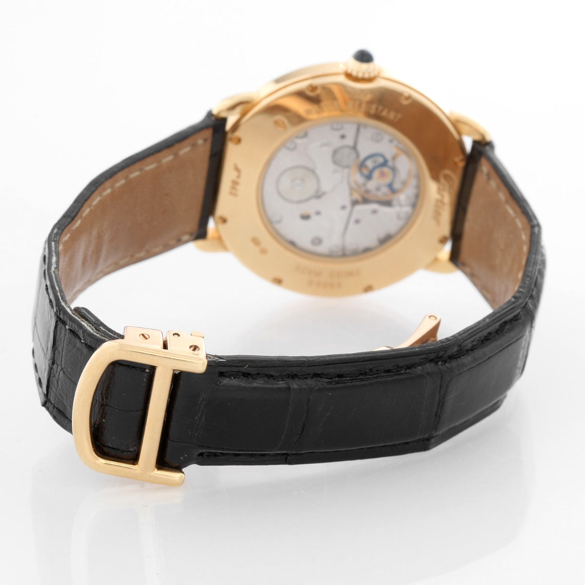Cartier 18K Yellow Gold Ronde Louis Ladies Watch WR000651 - Manual winding. 18K Yellow Gold case ( 33 mm). Guilloche dial with Roman numerals and Arabic numerals. Black Cartier strap with Cartier yellow gold deployant clasp. Pre-owned with Cartier box.