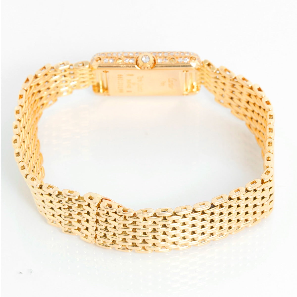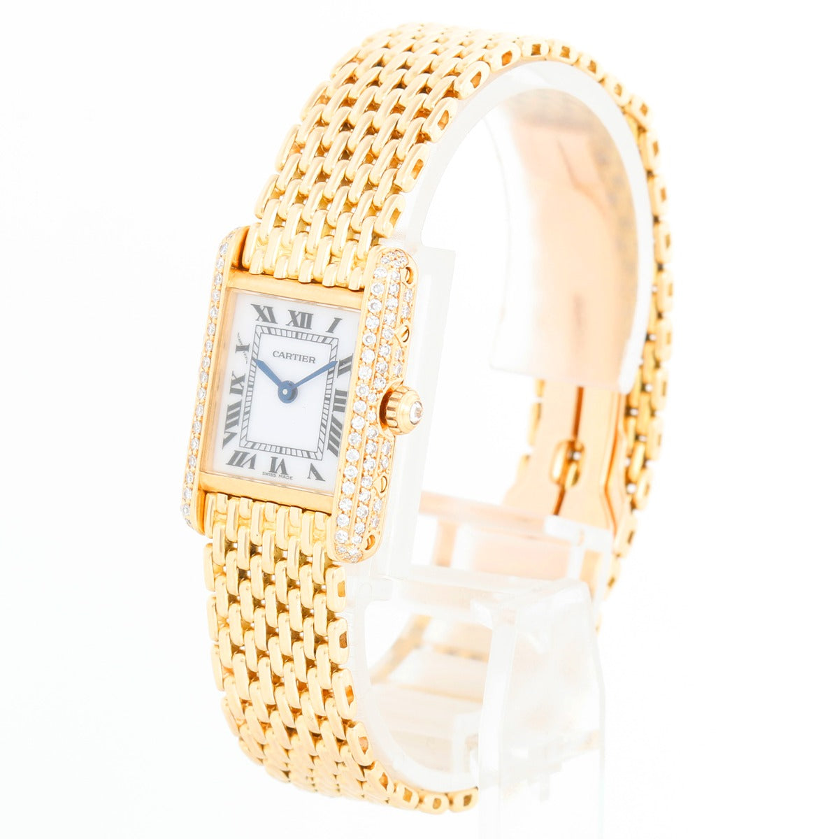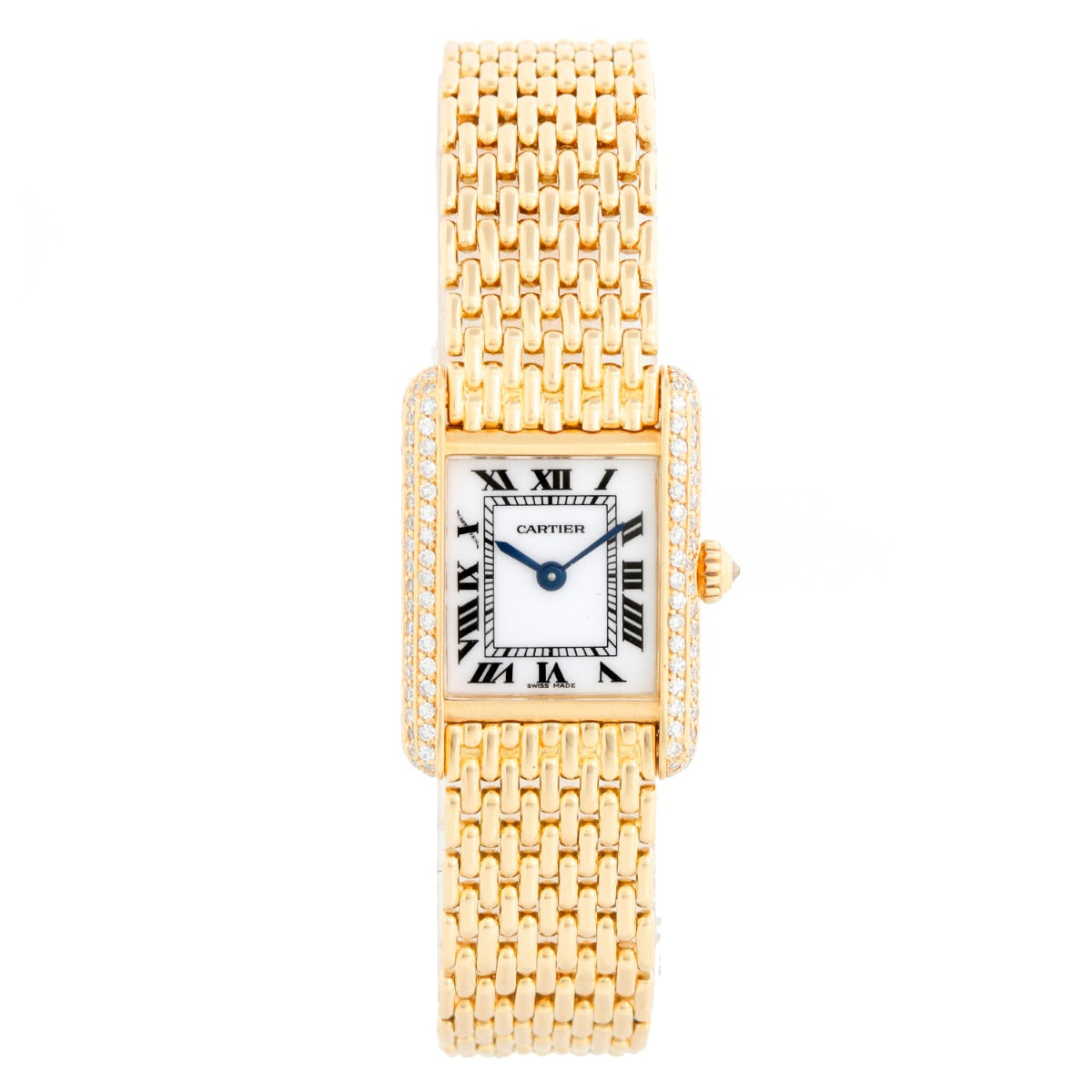 Cartier 18K Yellow Gold Tank Ladies Watch - Quartz. 18K yellow gold with diamond case ( 21 x 28 mm ). Silver tone dial with black roman numerals. Rice link bracelet with deployant clasp; will fit a 7 inch wrist. Pre-owned with Cartier box and service papers .