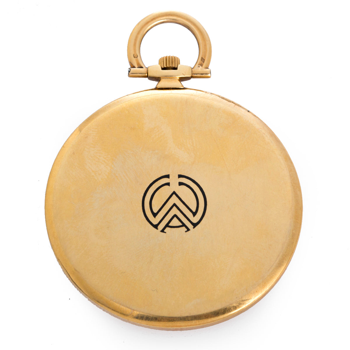 Cartier Art Deco 1940's Pocket Watch - Manual winding; 19 jewels. Ultra slim yellow gold case with "WA" enamel on the back (44mm). 2- tone silver guilloche dial with black painted Roman numerals to the inner chapter ring, Arabic numeral seconds to the outside and blue steel hands.. Pre-owned with custom box. Circa 1940's.