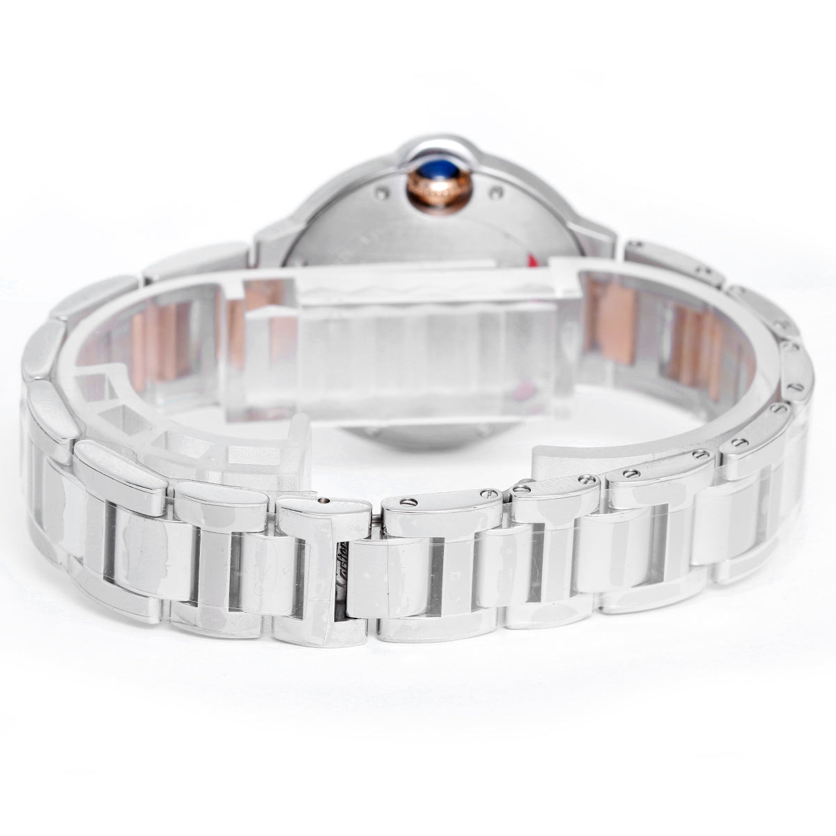 Cartier Ballon Bleu 2-Tone Midsize Automatic Steel & Rose Gold Watch W6920033- Automatic winding. Stainless steel case (36mm diameter). Factory Pink Mother of Pearl with black Roman numerals. Stainless steel and 18k rose gold Cartier bracelet. Pre-owned with custom box
