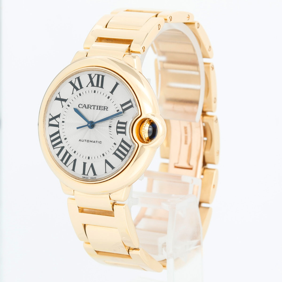 Cartier Ballon Bleu 36mm Men's/Ladies Midsize 18k Yellow Gold Watch W69003Z2 - Automatic winding. 18k yellow gold case (36mm diameter). Silver guilloche dial with black Roman numerals. 18k yellow gold Cartier bracelet with deployant clasp. Pre-owned with Cartier Box