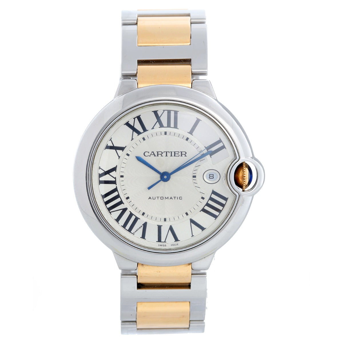 Cartier Ballon Bleu Men's 42mm Two Tone Automatic Watch W2BB0031 3001 - Automatic winding. Stainless steel case and yellow gold (42mm diameter). Silver guilloche dial with black Roman numerals; date at 3 o'clock. Stainless steel and yellow gold Cartier bracelet with deployant clasp; measures up to a 7 3/4 wrist. Pre-owned with custom box.