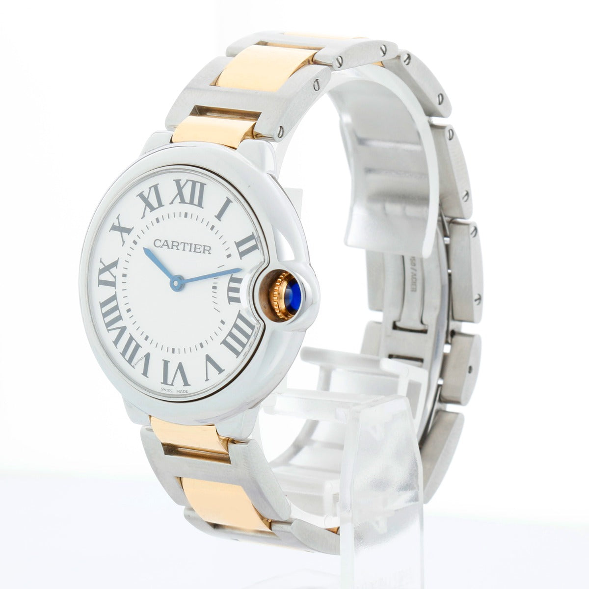 Cartier Ballon Bleu Midsize Stainless Steel & Yellow Gold Watch W69008Z3 3005 - Quartz. Stainless steel and yellow gold case (36mm). Silver guilloche dial with black Roman numerals. Stainless steel and yellow gold Cartier bracelet with deployant clasp. Pre-owned with custom box.
