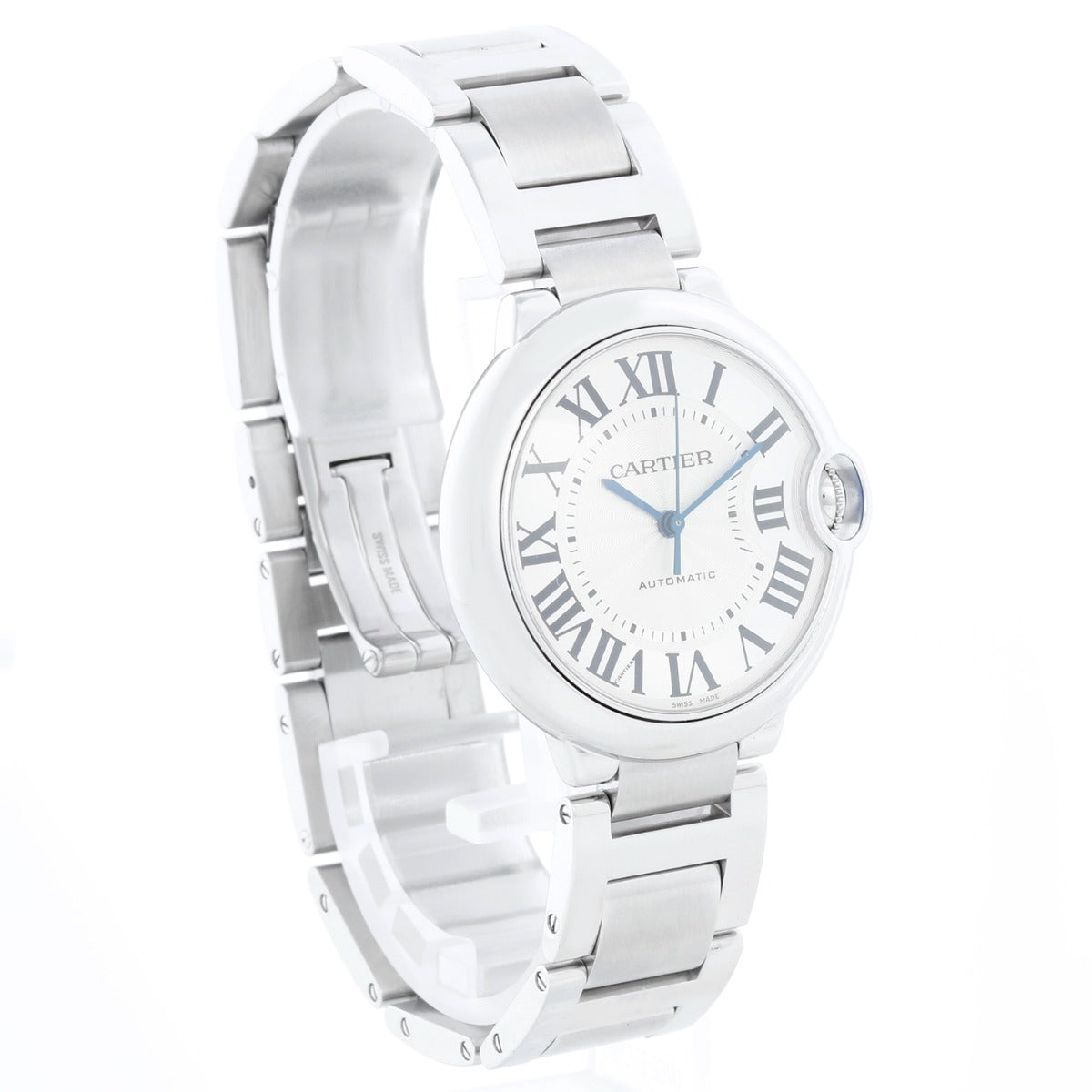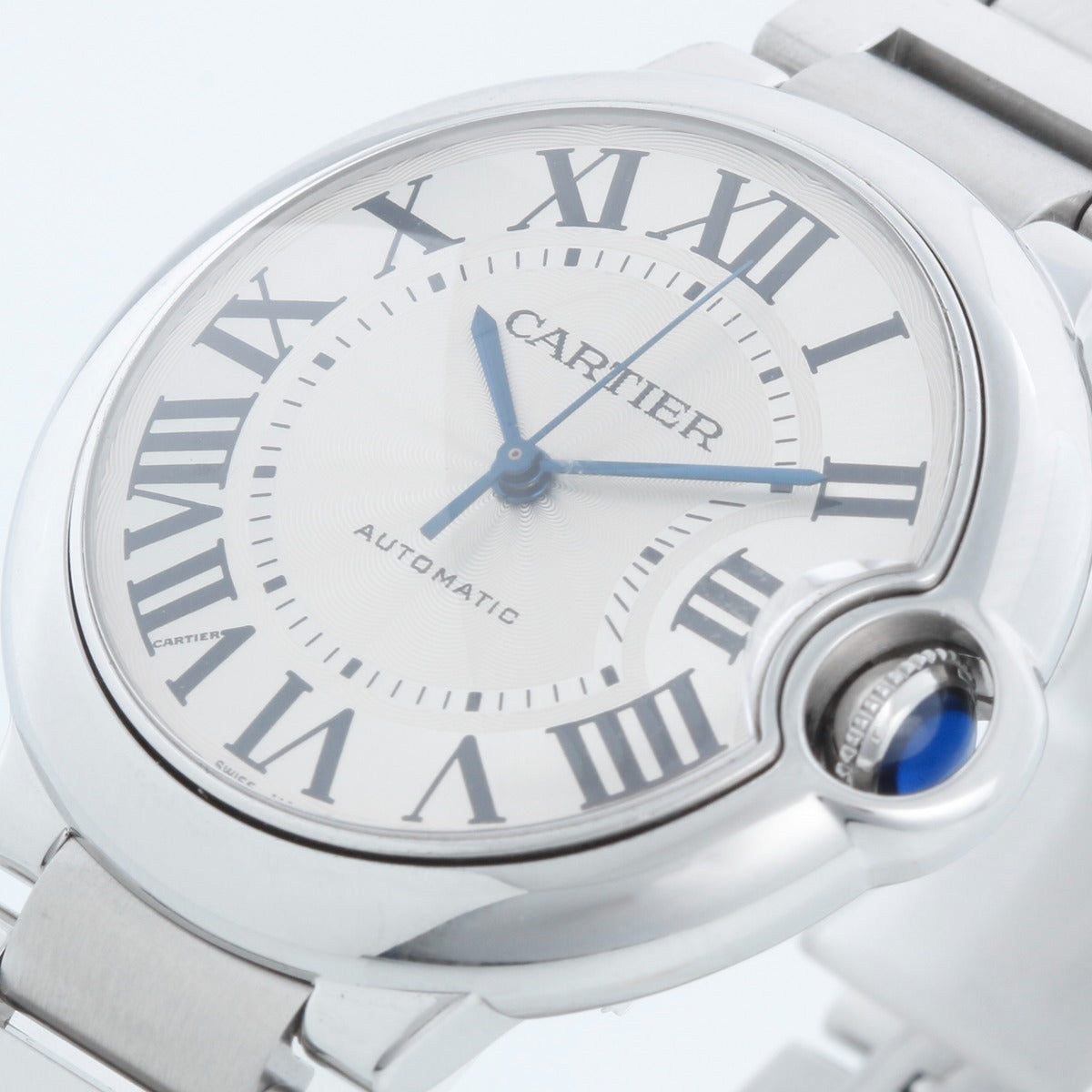 Cartier Ballon Bleu Midsize Stainless Steel Watch W6920046 3284 - Automatic. Stainless steel case (36mm). Silver guilloche dial with black Roman numerals. Stainless steel Cartier bracelet with deployant clasp.. Pre-owned with Cartier box, papers and books. Dated 2010.