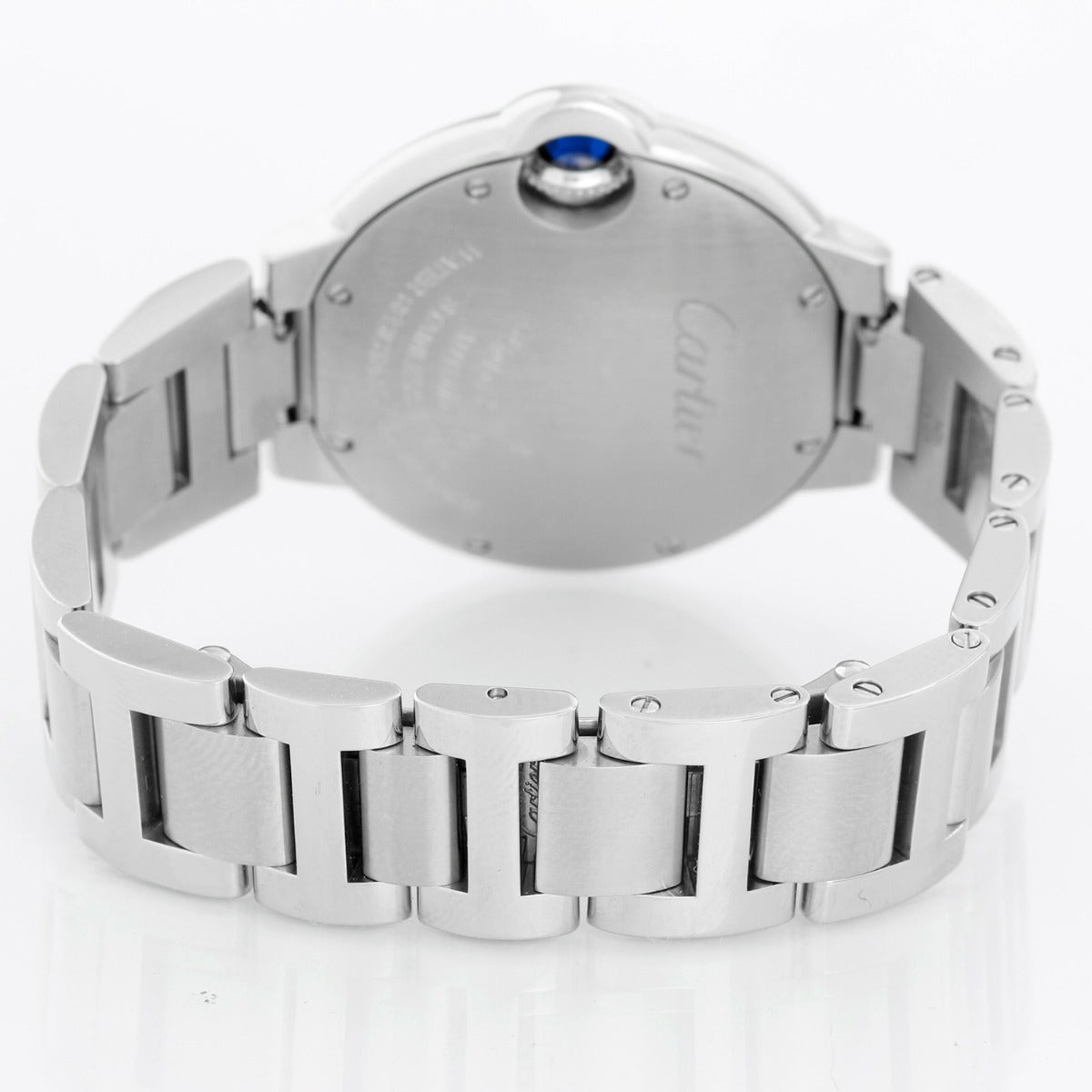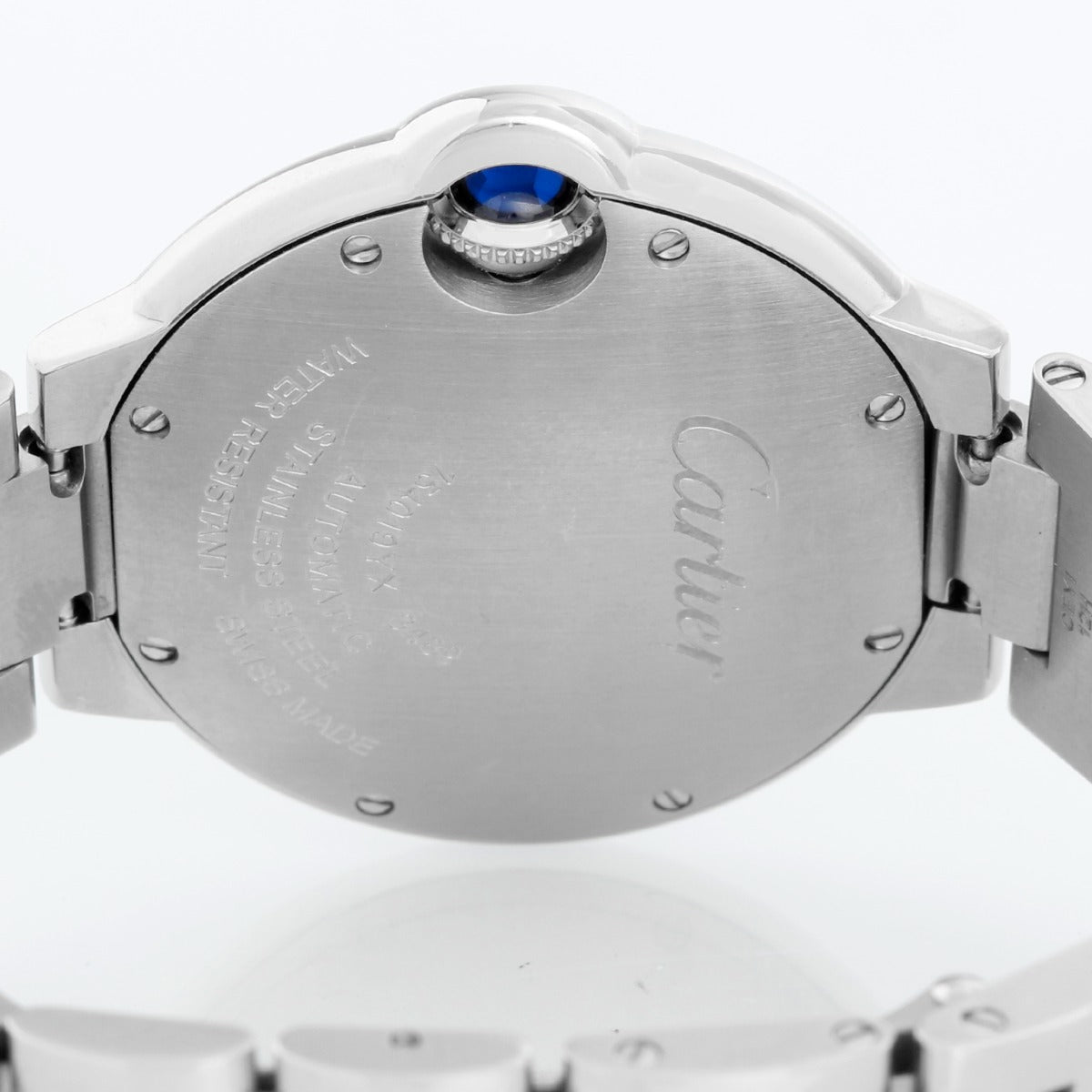 Cartier Ballon Bleu Stainless Steel Watch w6920071 - Automatic. Stainless steel case (33mm). Silver guilloche dial with black Roman numerals. Stainless steel Cartier bracelet with deployant clasp; will fit a 5 3/4 inch wrist . Pre-owned with Cartier box and papers.