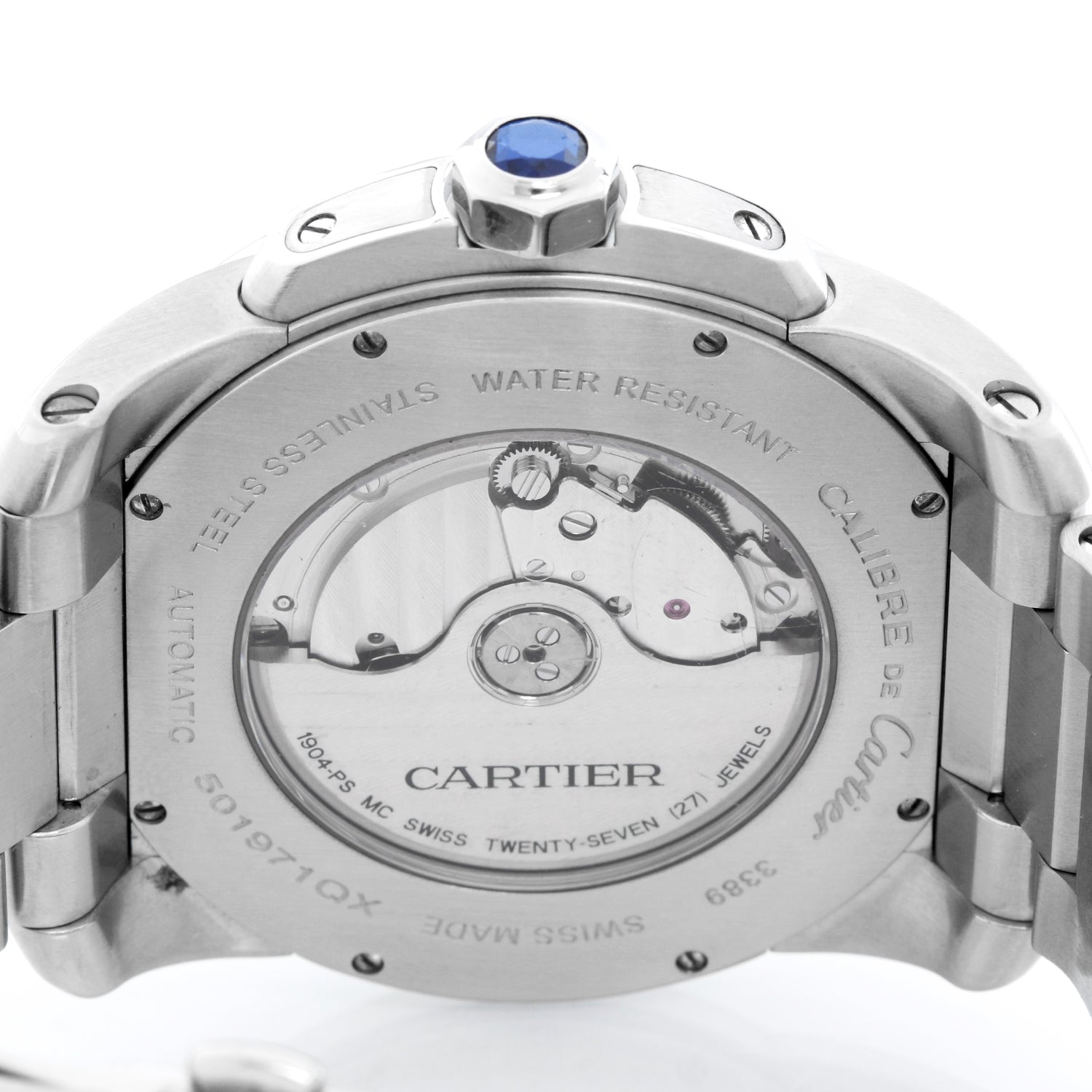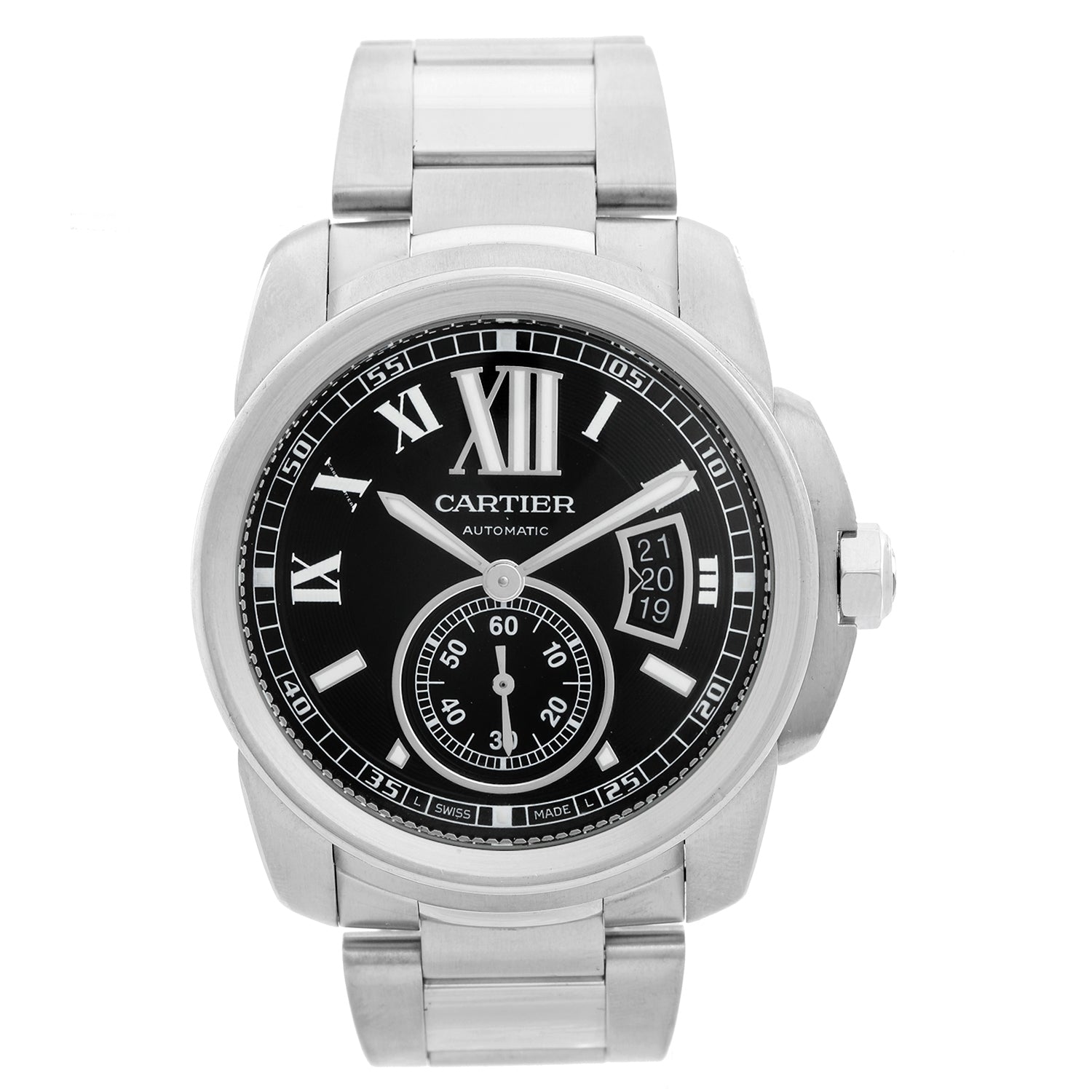 Cartier Calibre Stainless Steel Men's 42mm Watch W7100015- Automatic winding. Stainless steel case with exposition back (42mm diameter). Black dial with white Roman numerals and stick markers; date at 3 o'clock, subseconds at 6 o'clock. Stainless steel bracelet. Pre-owned with Cartier box and books.