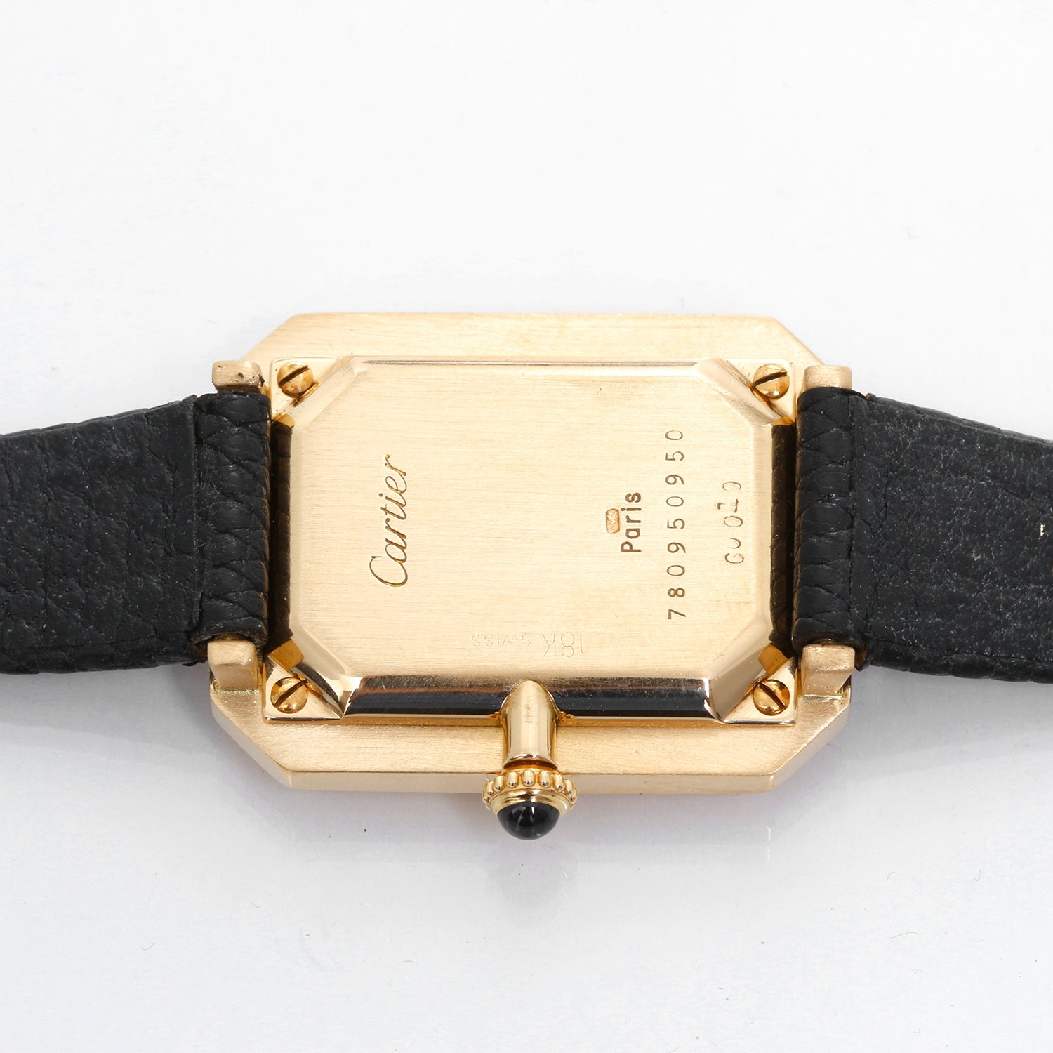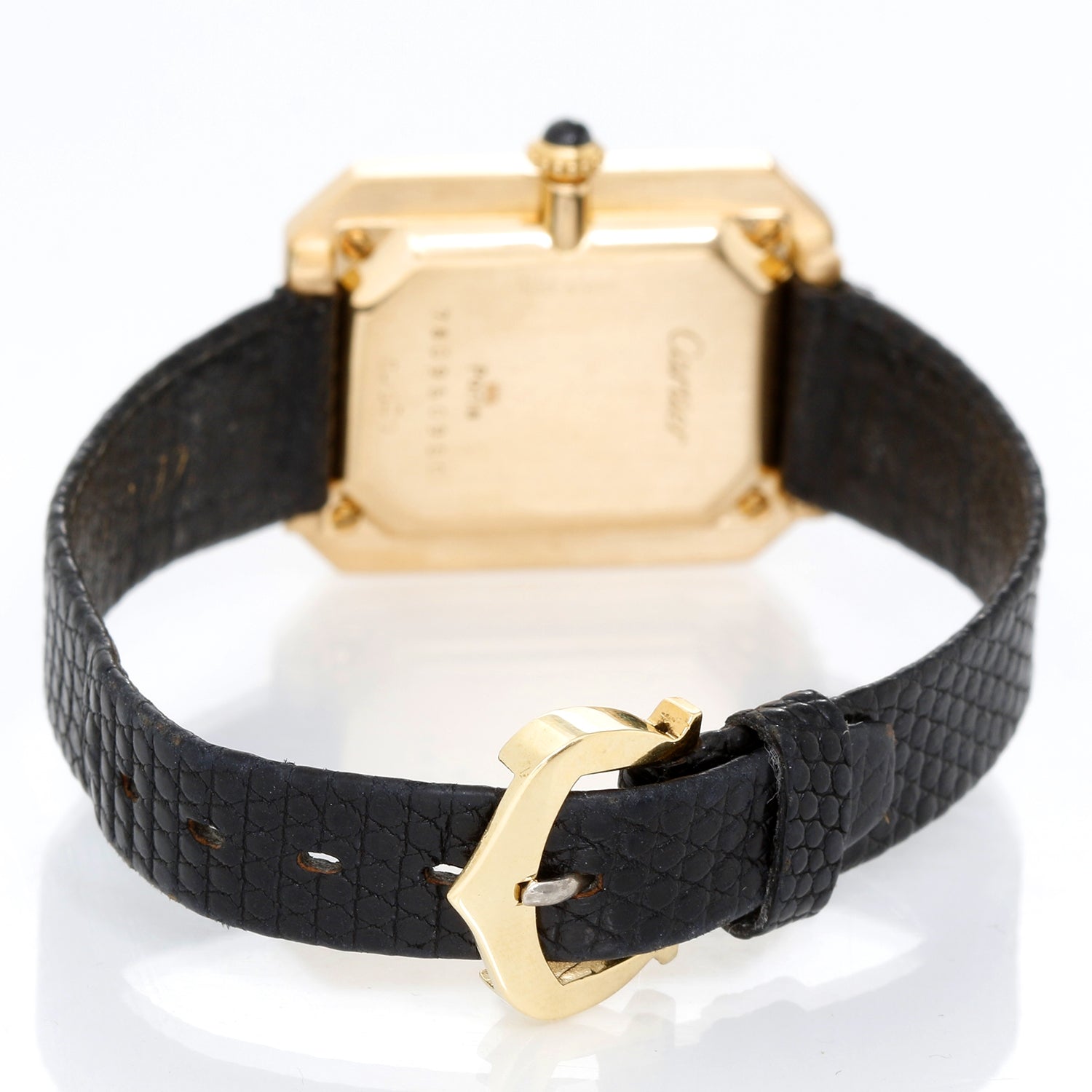 Cartier Ceinture 18K Yellow Gold Unisex Watch - Quartz. 18K Yellow Gold ( 30 x 24 mm ). White dial with Roman numerals. Black leather strap with buckle. Pre-owned with custom box.