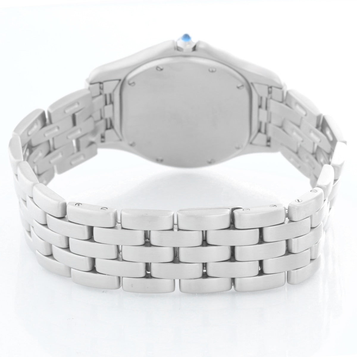Cartier Cougar Men's/Ladies Midsize 33mm Stainless Steel Quartz Watch - Quartz. Stainless steel case (33mm diameter). Ivory colored dial with black Roman numerals; date at 3 o'clock position. Stainless steel bracelet (will fit apx. 7-1/4 inch wrist). Pre-owned with service box and has a full service from Cartier.